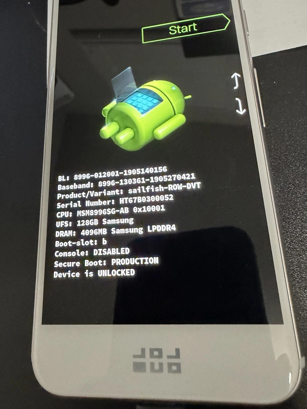 从商品图中的启动引导程序和系统界面可以看到,该设备的识别代号为“sailfish-ROW-DVT”。其中,“sailfish”是初代 5 英寸 Pixel 手机的内部代号,而 DVT(设计验证测试)则是量产前用于敲定硬件最终方案的后期原型机阶段。