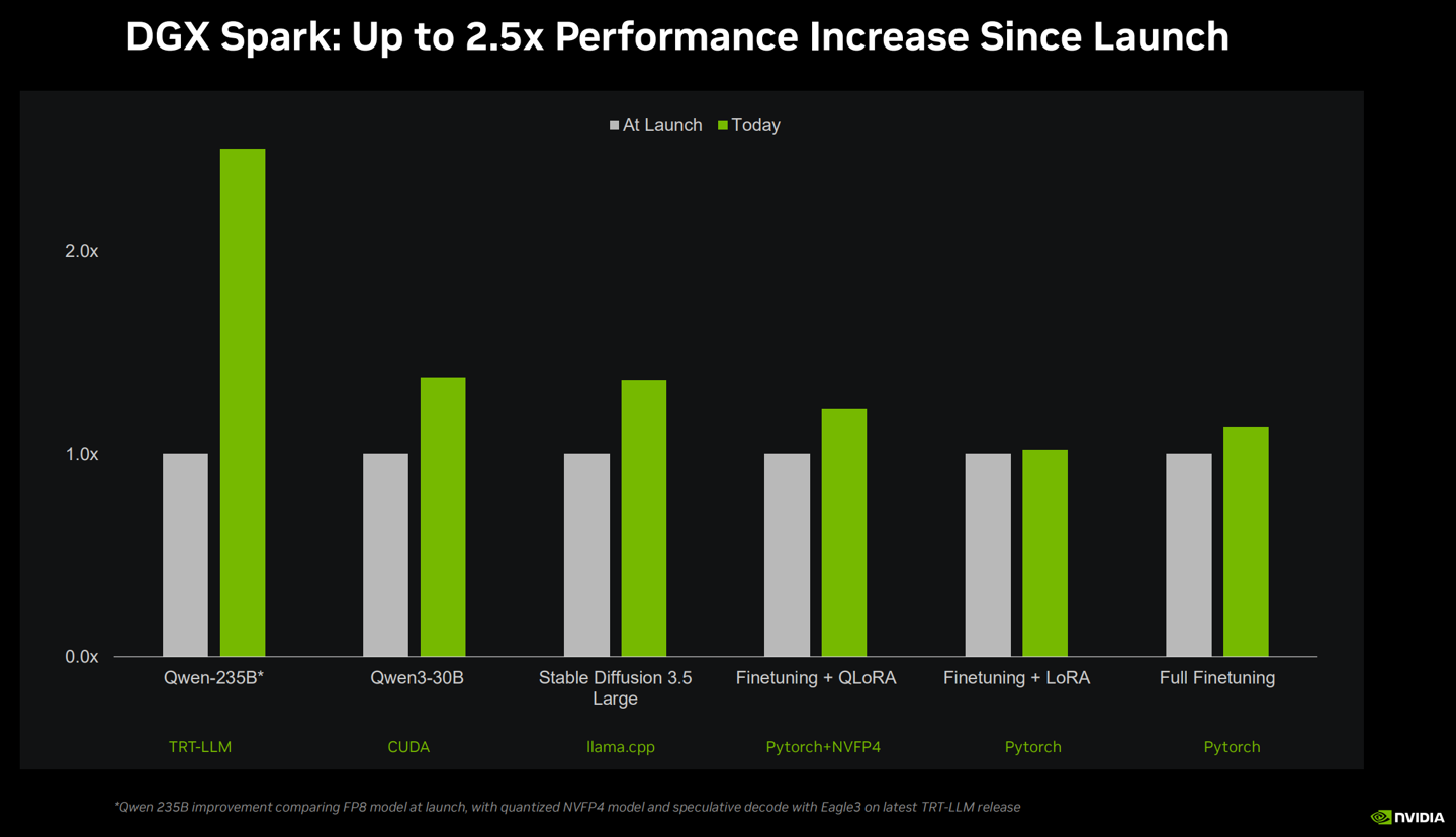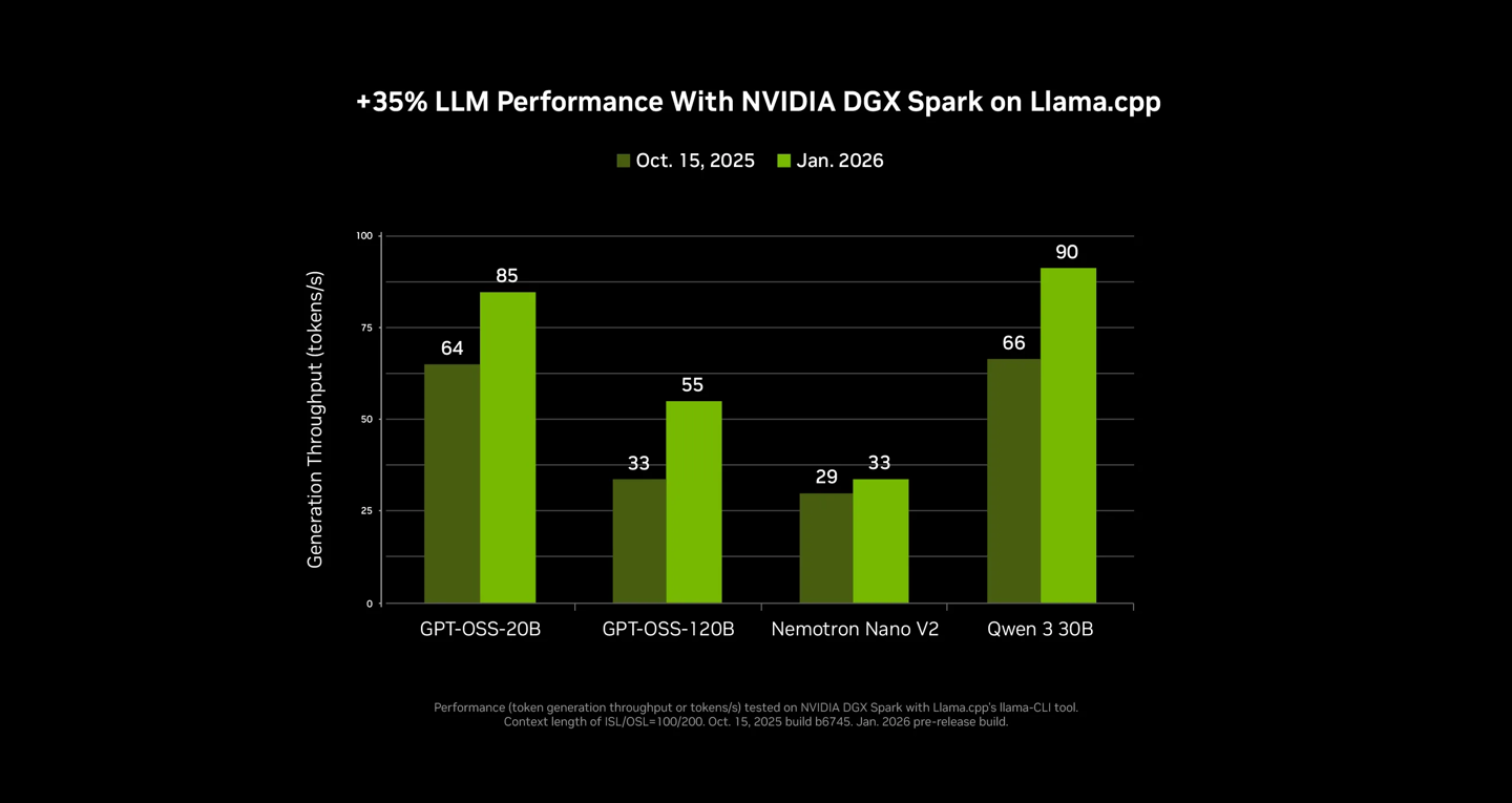 此外,英伟达优化与开源社区(如 llama.cpp)的深度合作,该系统在运行 SOTA(最先进)模型时平均性能提升了 35%,并显著加快了 LLM(大语言模型)的加载速度。