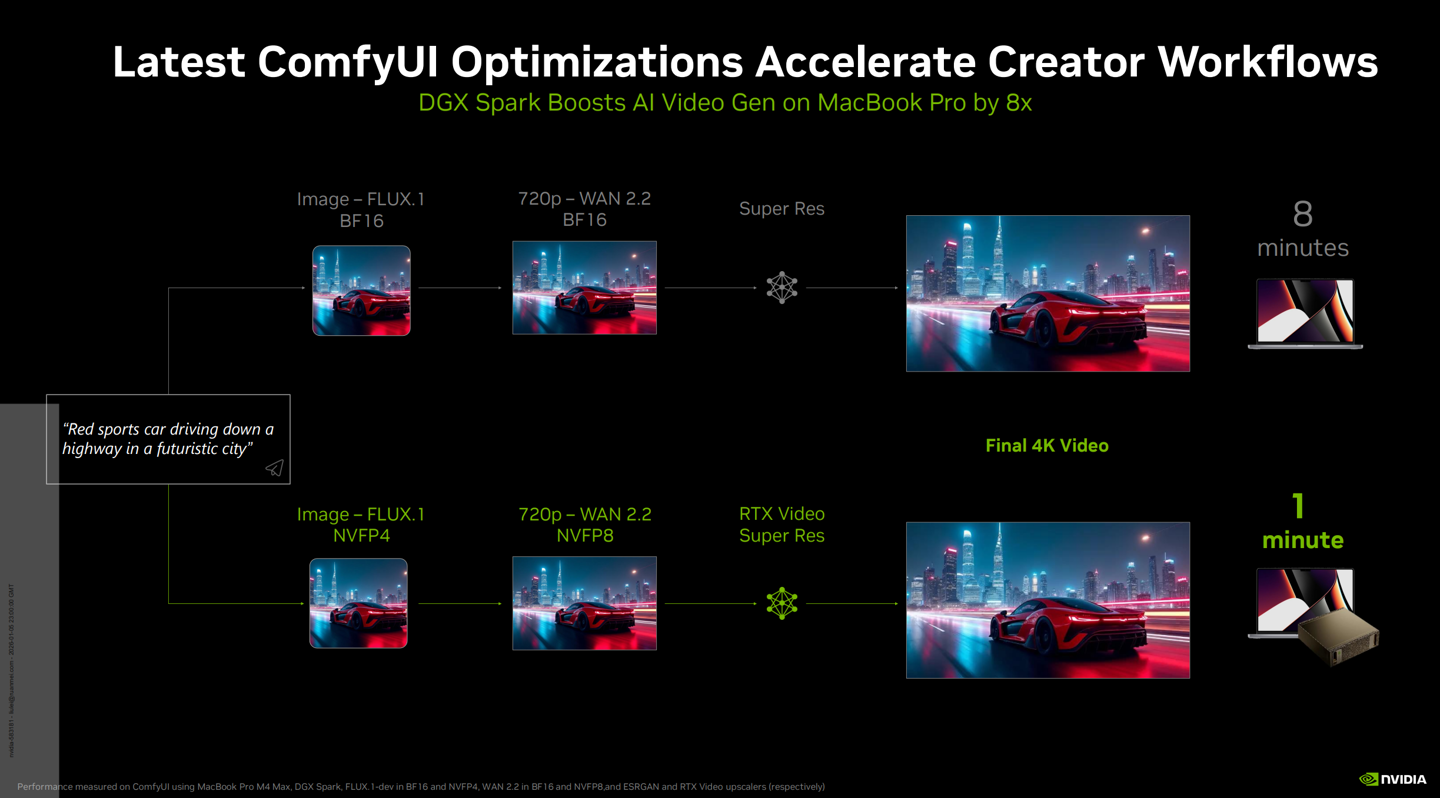 图源:英伟达在实际应用场景中,DGX Spark 展现了惊人的性能优势:在运行 Black Forest Labs 的 FLUX.2 等视频生成模型时,其速度相比搭载 M4 Max 芯片的顶级 MacBook Pro 快了 8 倍。