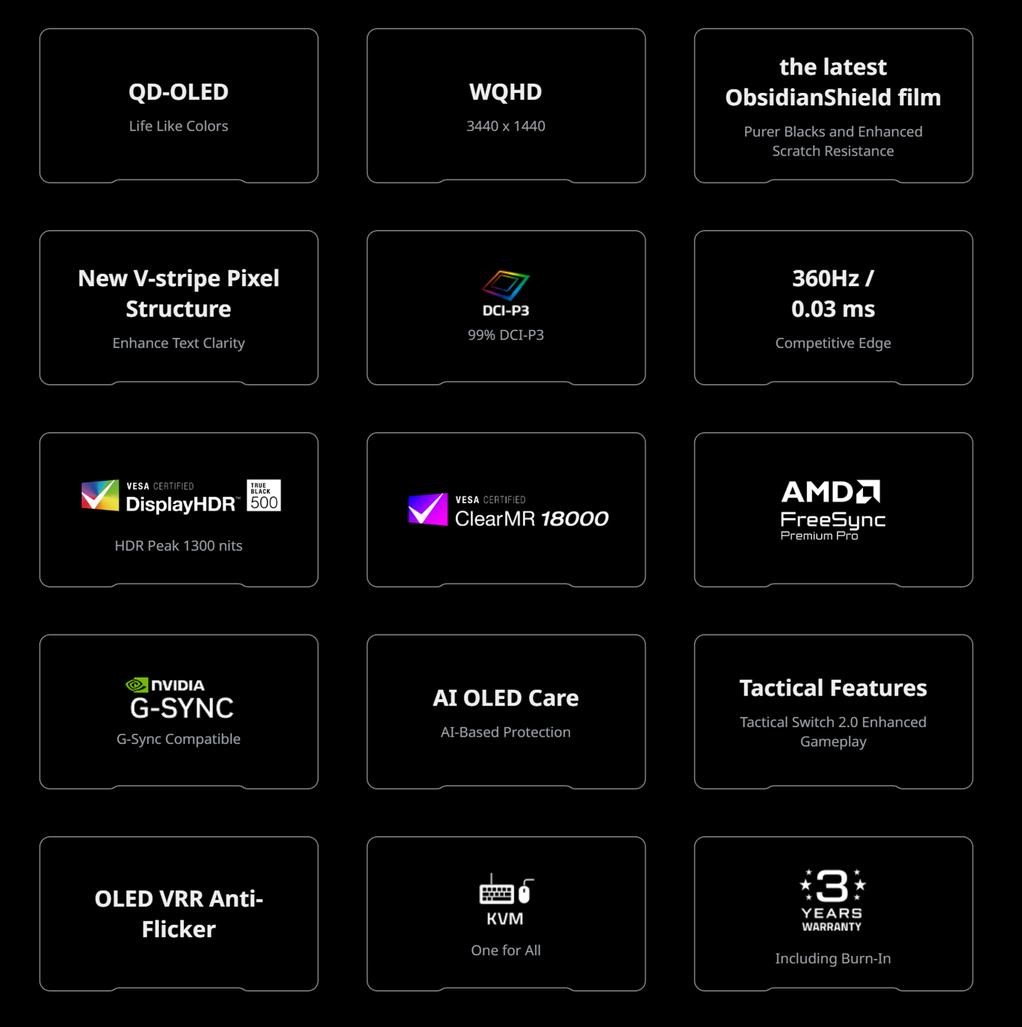 这款显示器搭载一块 34 英寸 OLED 面板,采用类带鱼屏设计,分辨率为 3440*1440,配备三星 V-Stripe 次像素技术,可提升画面清晰度以及文字显示效果。