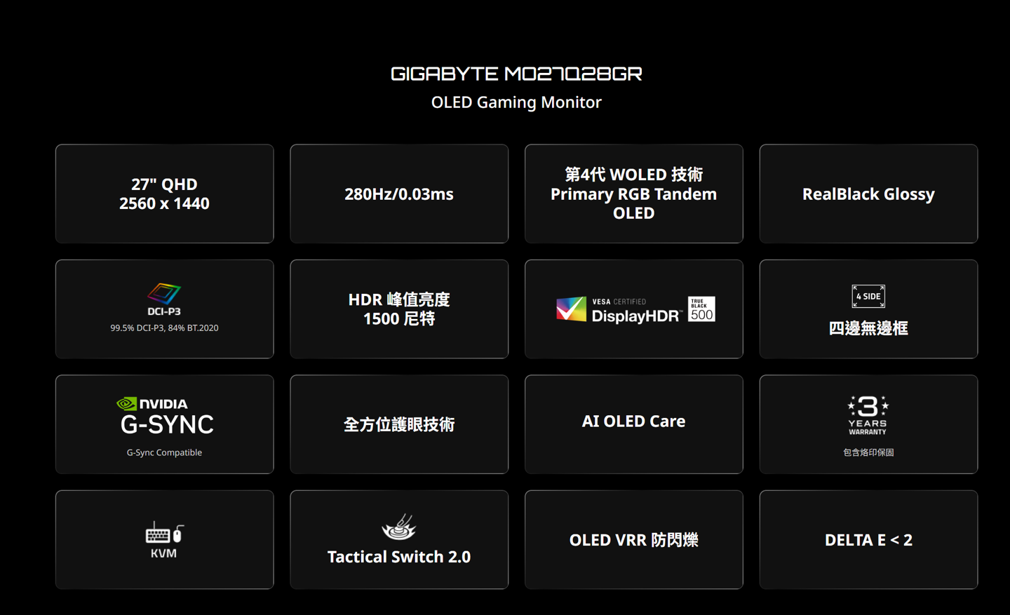 这款显示器已在去年末上市,搭载 27 英寸 RealBlack Glossy WOLED 面板,分辨率为 2560*1440(2K),刷新率最高可达 280Hz,通过 HDR True Black 500 认证,峰值亮度可达 1500 尼特,支持 VESA 100x100mm 壁挂,同时内置双 5W 扬声器,标价 3399 元。