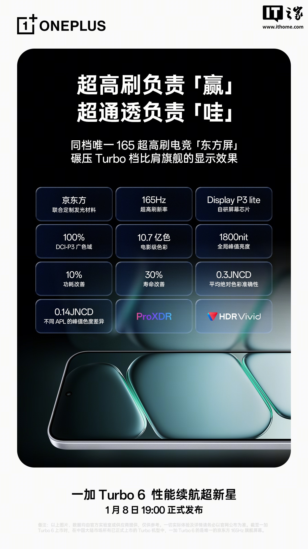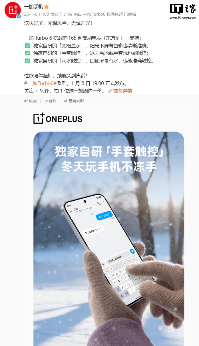 IT之家 1 月 6 日消息,一加手机正持续预热 Turbo 6 系列手机,根据官方今日公布的最新信息来看,系列新机将搭载 165 超高刷电竞「东方屏」,号称“兼具 165Hz 超高刷新率、比肩旗舰的显示效果、医显共研的明眸护眼”。