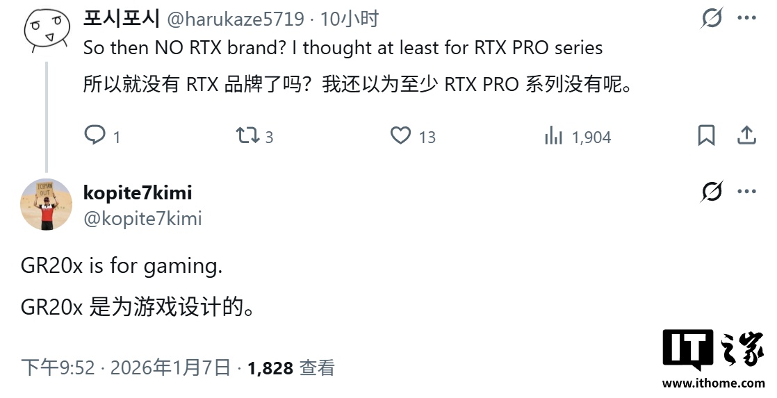 IT之家 1 月 8 日消息,消息源 @Kopite7kimi 昨日(1 月 7 日)在 X 平台发布推文,透露英伟达计划 2027 年下半年推出 GeForce RTX 60 系列显卡,将采用代号为 Rubin 的全新架构,核心 GPU 家族代号确认为 GR20x。