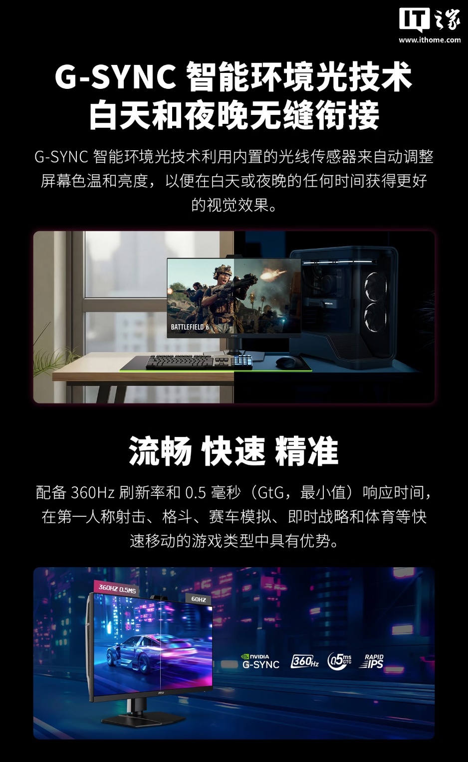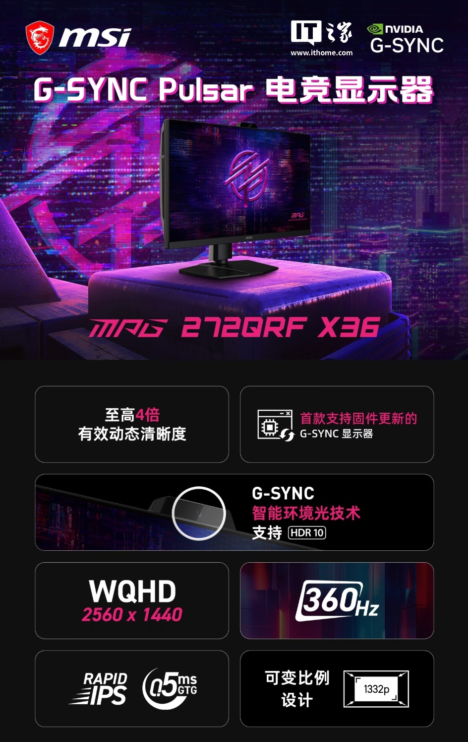 微星强调,该产品搭载了英伟达 G-SYNC 技术,能够在支持可变刷新率的同时,实现至高 4 倍的有效动态清晰度,确保在快节奏的游戏过程中也能实现精准瞄准和清晰的运动画面。