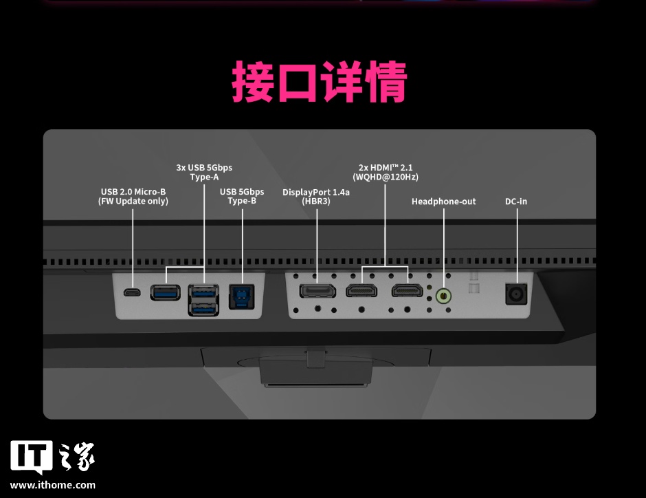 该显示器内置光线传感器,可自动调整色温和亮度。显示器本体支持 VESA 100x100mm 壁挂,提供 1 个 DP 1.4(360Hz)接口、2 个 HDMI 2.1 接口(120Hz)、3 个 USB-A 5Gbps(KVM)、1 个 3.5mm 接口。