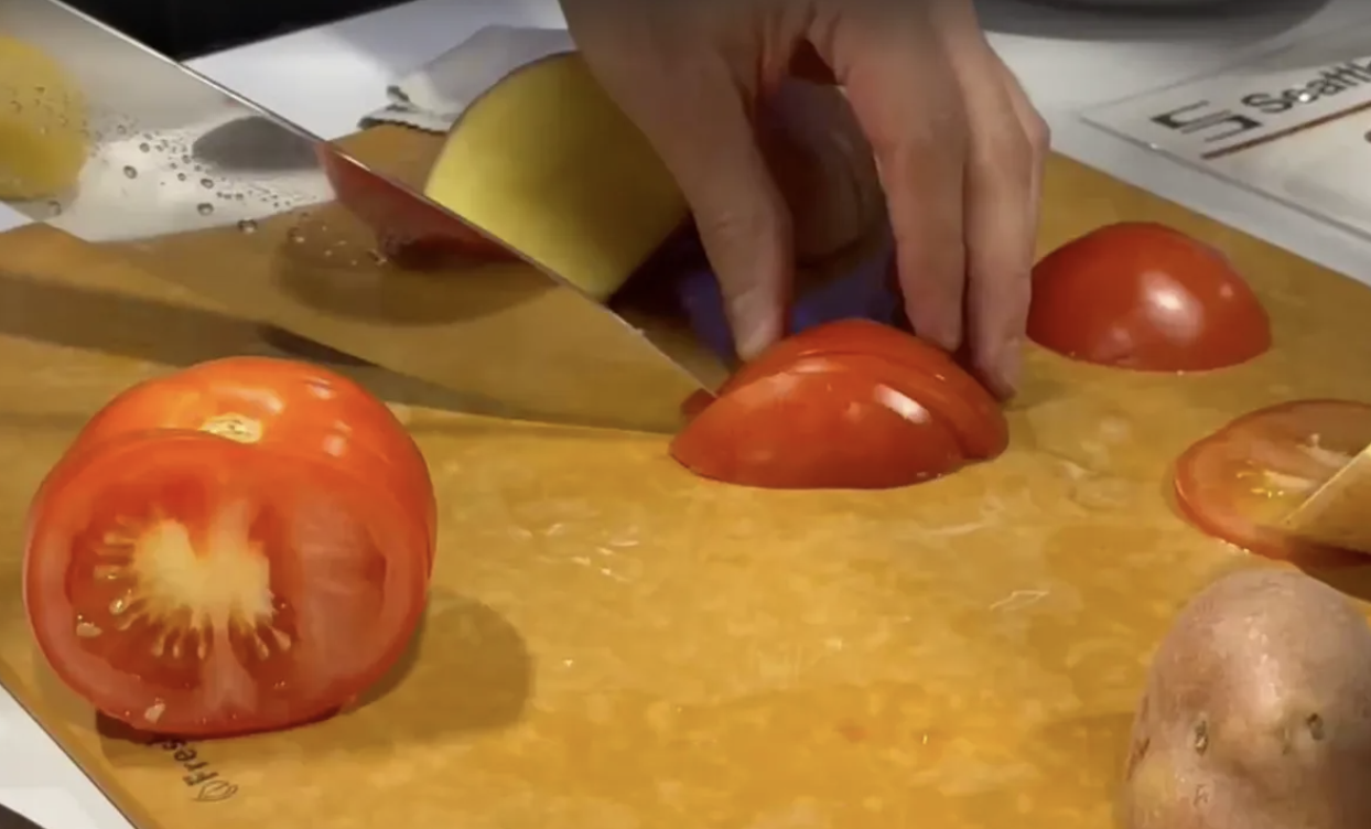 在对准番茄下刀时,效果如厂商宣传所说,几乎不需要用力,刀刃就顺畅地滑了下去。抬起刀时,番茄切片也能自然脱离刀面。外媒又尝试了几次更精细的切割,发现这把刀在切薄片时,确实比普通厨刀更轻松。
