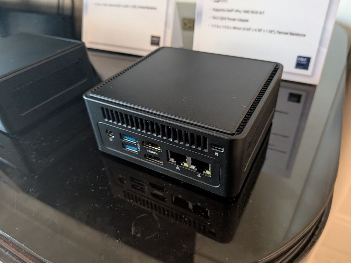 华擎工业(ASRock Industrial)子品牌在豪华套房内展示了全新的 NUC (S) Ultra 300 BOX 系列。该系列在移动处理器技术上紧跟前沿,尽管现场代表未确认演示样机内的具体型号,但旁边的规格表证实,这款嵌入式解决方案搭载了英特尔最新推出的 Core Ultra Series 300 “Panther Lake-H” APU。