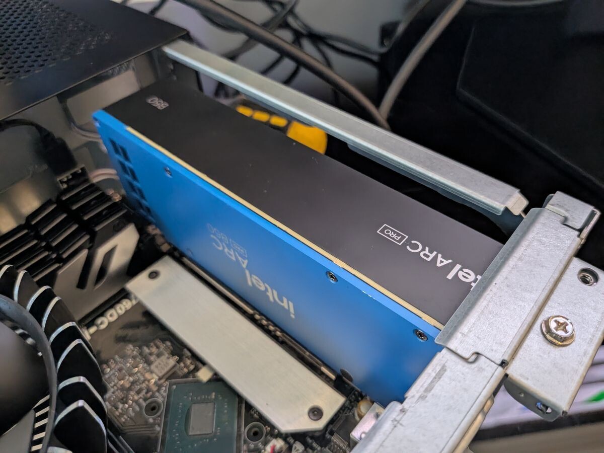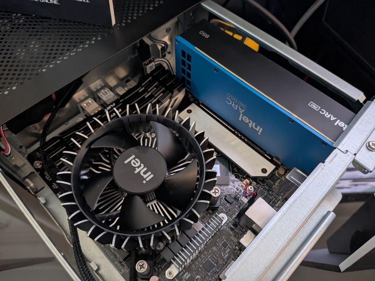 华擎在 CES 2026 展会上,实机展示了 DeskSlim B760,这款迷你主机拥有 4.9 升的超紧凑机箱,内部结构经过精心设计,成功容纳了英特尔公版 Arc Pro B50 “Battlemage”工作站级显卡。
