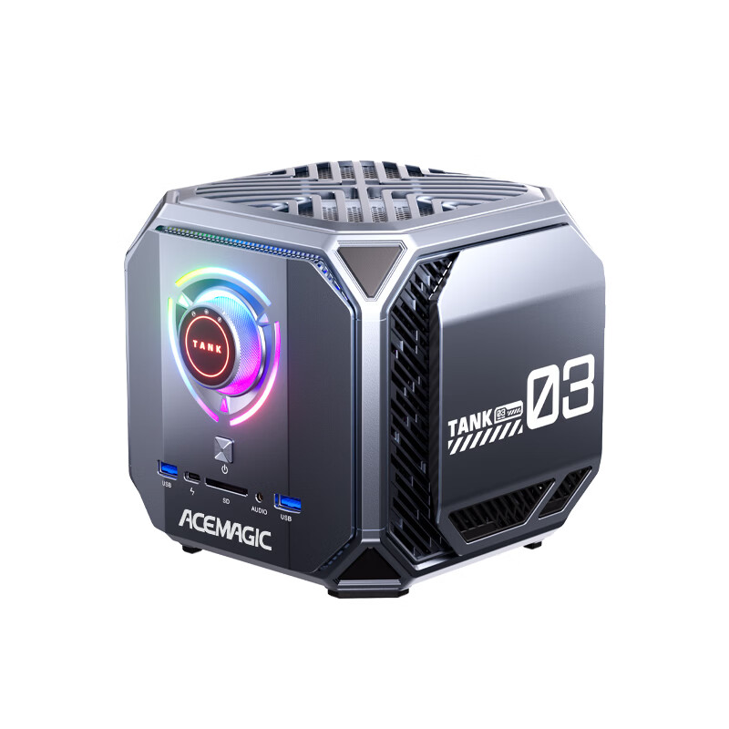 ACEMAGIC M1A PRO 延续了此前产品的“银魔坦克”切角立方体外形设计,三维 166.7×166.9×160.9 (mm),支持锁扣快拆。