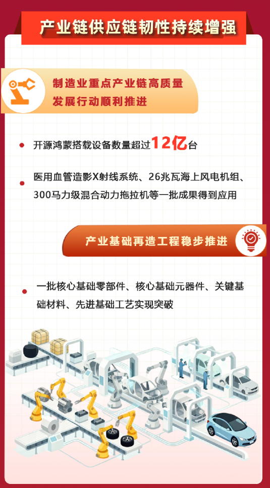 IT之家注意到,在这张成绩单的产业链供应链部分提到,我国制造业重点产业链高质量发展行动顺利推进,开源鸿蒙搭载设备数量超过 12 亿台。另外,一批核心基础零部件、核心基础元器件、关键基础材料、先进基础工艺也实现突破。