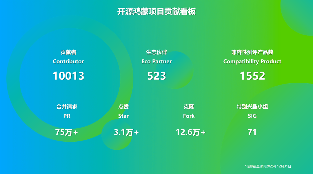 开源鸿蒙社区发布的 2025 年 12 月运营报告显示,截至 2025 年 12 月 31 日,开放原子开源鸿蒙社区累计 10013 名贡献者和 523 家生态伙伴,通过兼容性产品数 1552 款,产生 75 万个 PR、3.1 万个 Star、12.6 万个 Fork,共计 71 个 SIG 组。