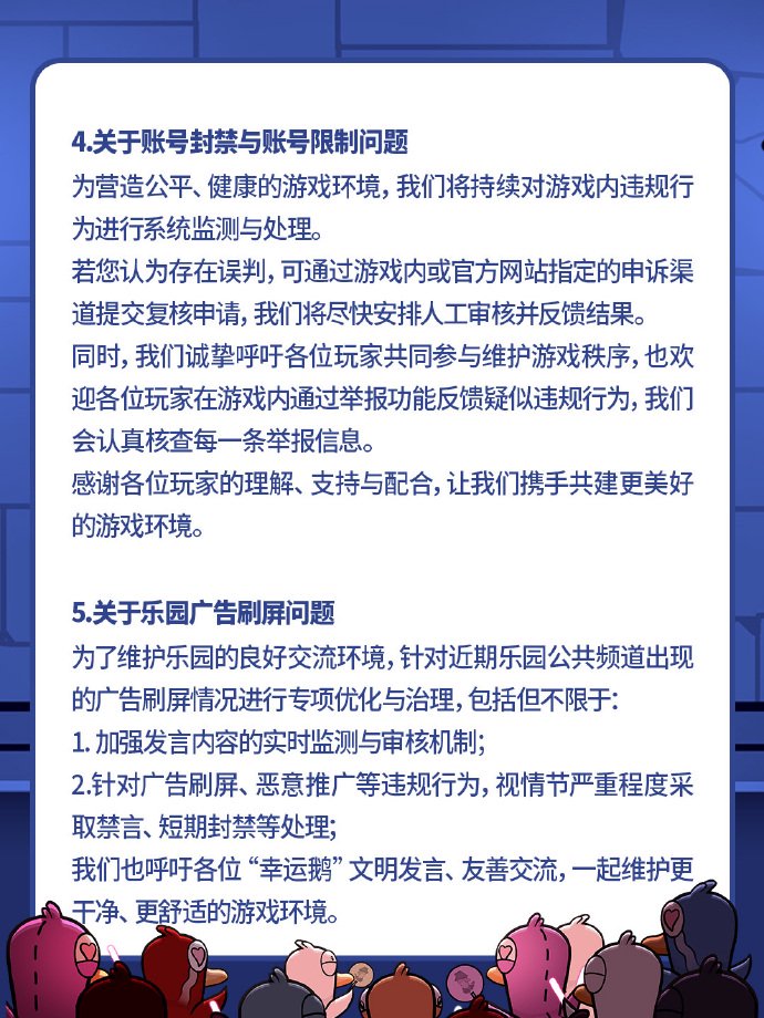 我们也呼吁各位“幸运鹅”文明发言、友善交流,一起维护更干净、更舒适的游戏环境。