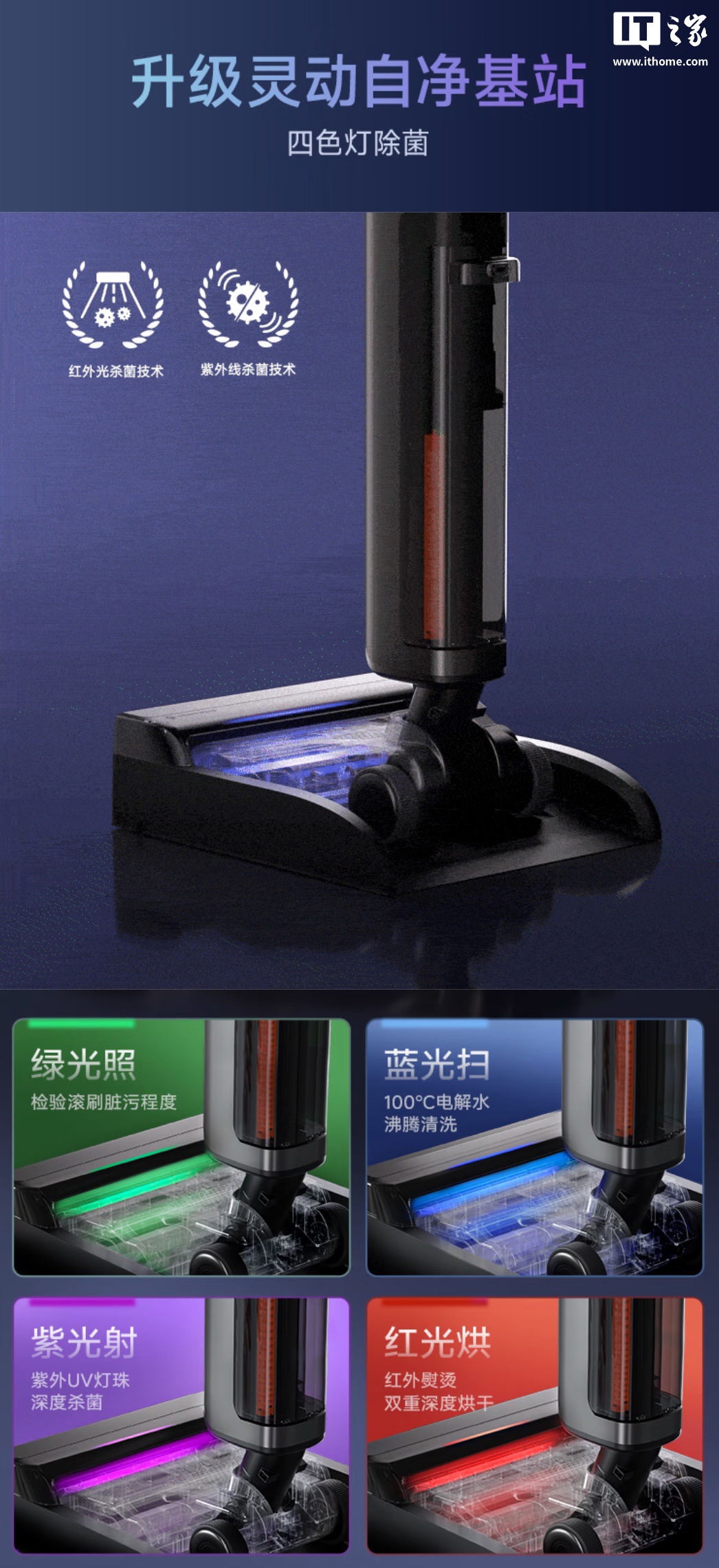 该洗地机号称升级自清洁体验,将洗地机推入基站后即可自动开启自清洁流程,同时基站带有 RGB 灯,可以通过 RGB 灯具体颜色来判断洗地机基站处于何种模式。