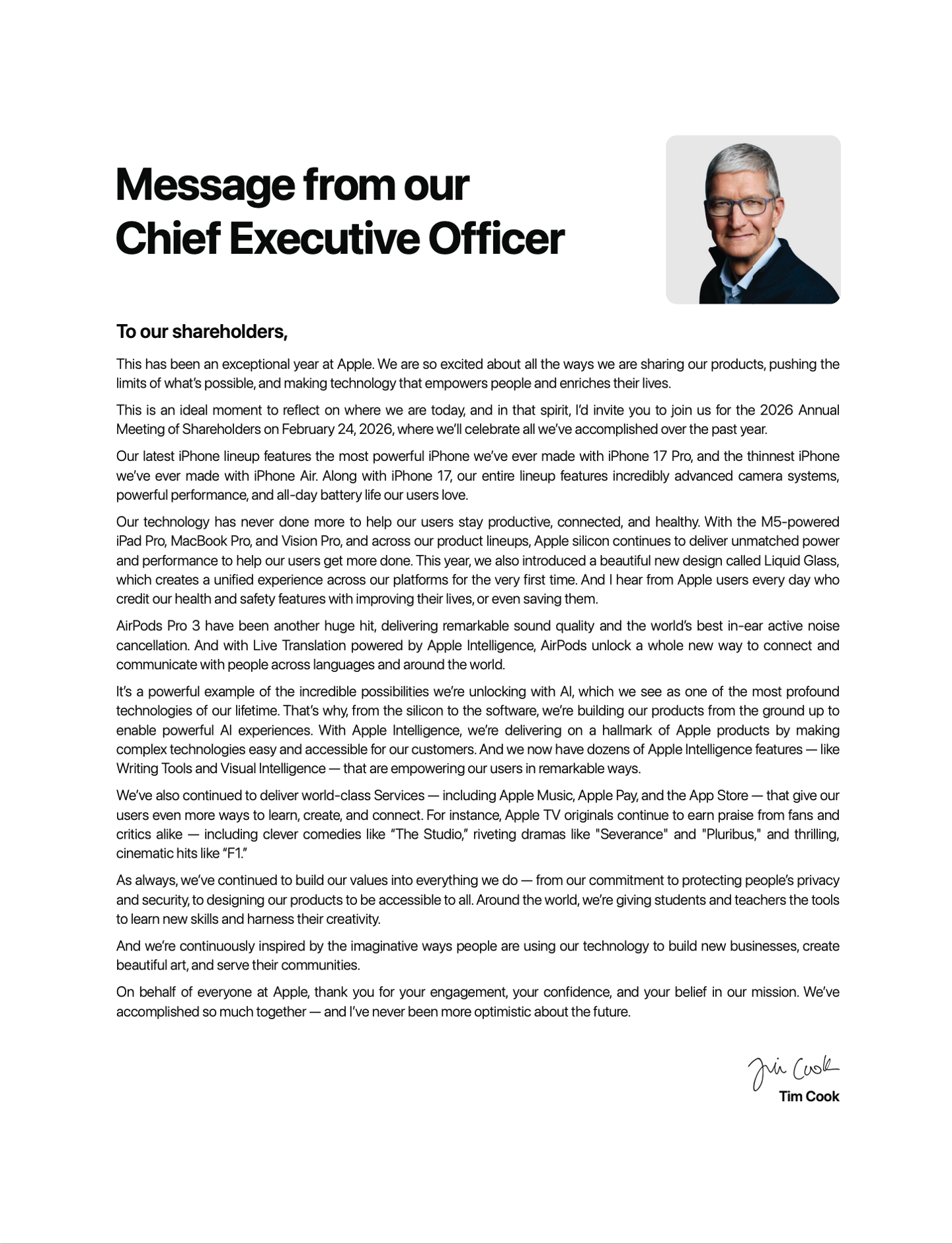 当前正是回顾成果的合适时机。在此,我诚邀各位于 2026 年 2 月 24 日参加苹果 2026 年度股东大会,届时我们将共同回顾并庆祝过去一年取得的重要进展。