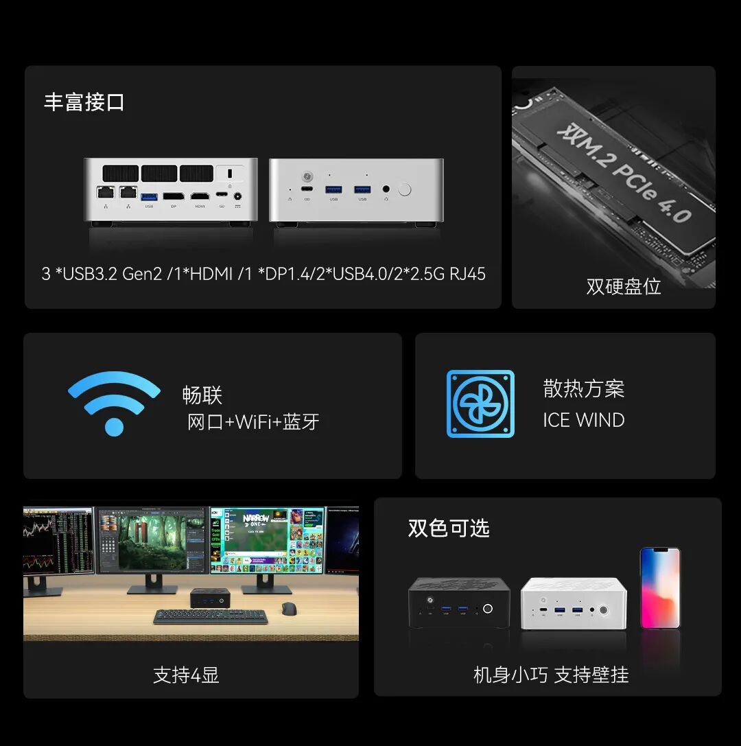 M234 内部搭载 ICE WIND 散热方案,支持 DDR5 内存,提供 2 个 PCIe 4.0 的 M.2 盘位,搭载无线网卡;而在外部,其提供 2 个 USB4、3 个 USB 10Gbps、2 个 2.5GbE RJ45、1 个 HDMI、1 个 DisplayPort 2.1,支持四路视频信号输出。