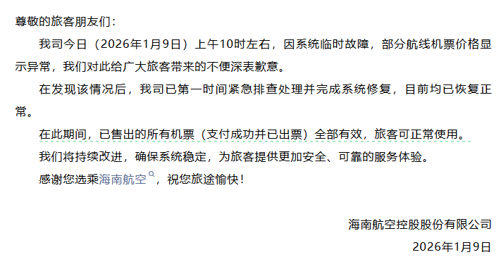 我司今日(2026 年 1 月 9 日)上午 10 时左右,因系统临时故障,部分航线机票价格显示异常,我们对此给广大旅客带来的不便深表歉意。