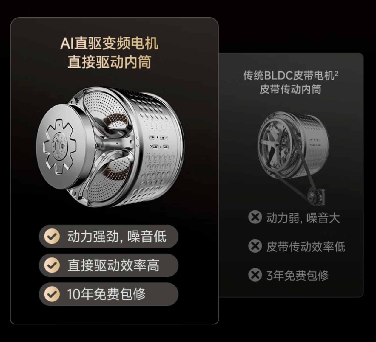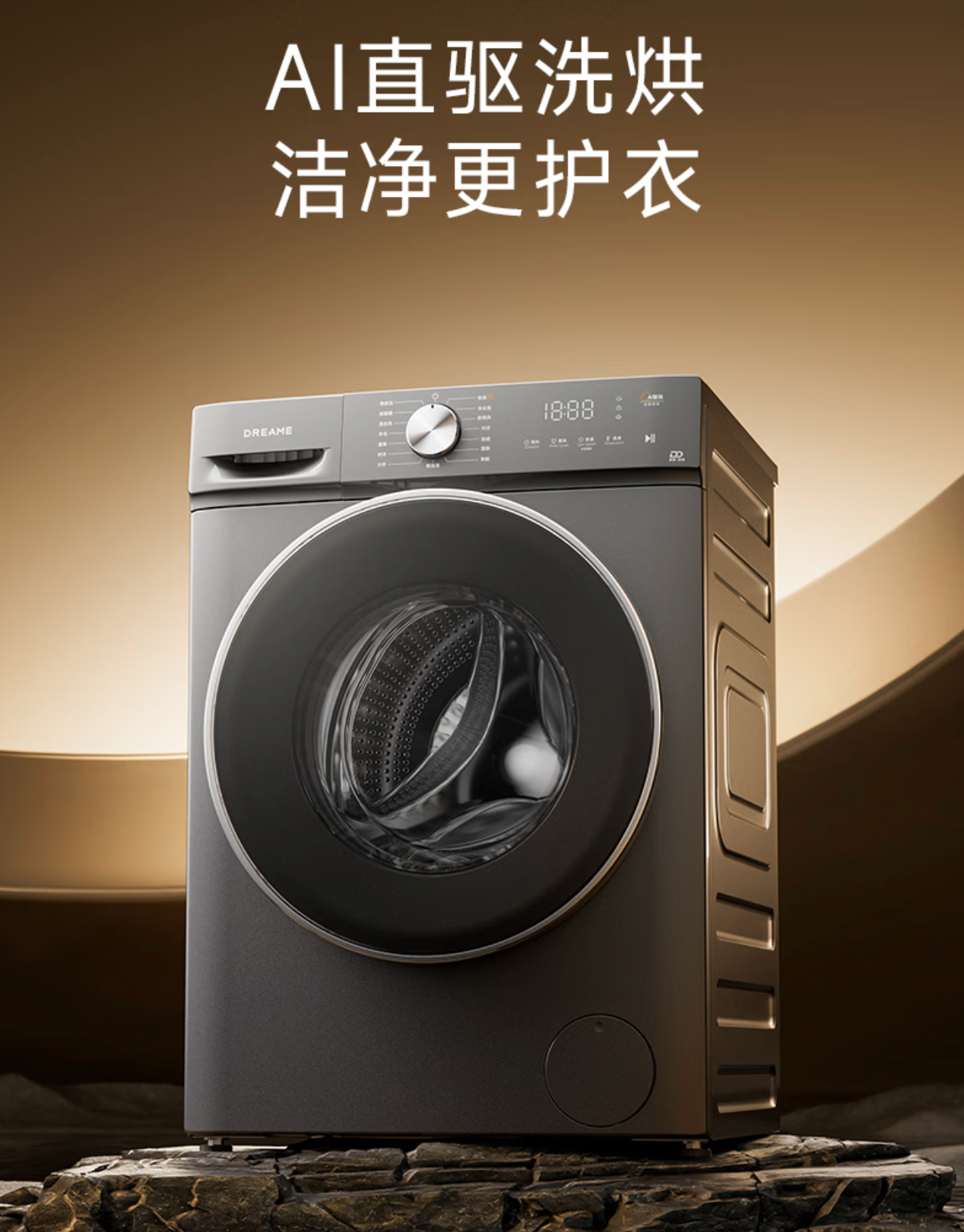 此款配备直驱变频电机,且搭载 AI 算法,可精控洗涤轨迹,洁净不伤衣。
