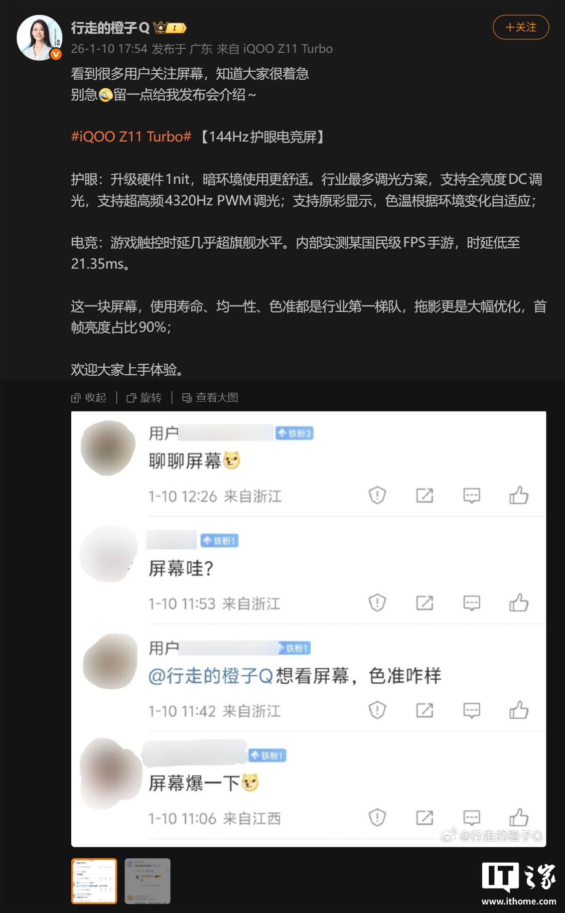▲ IT之家实拍:iQOO Z11 Turbo她还透露,这台手机的游戏触控时延几乎“超旗舰水平”,内部测试某国民级 FPS 手游时延低至 21.35ms,并且屏幕本身的使用寿命、均一性、色准都是“行业第一梯队”,还大幅优化了拖影,首帧亮度占比 90%。