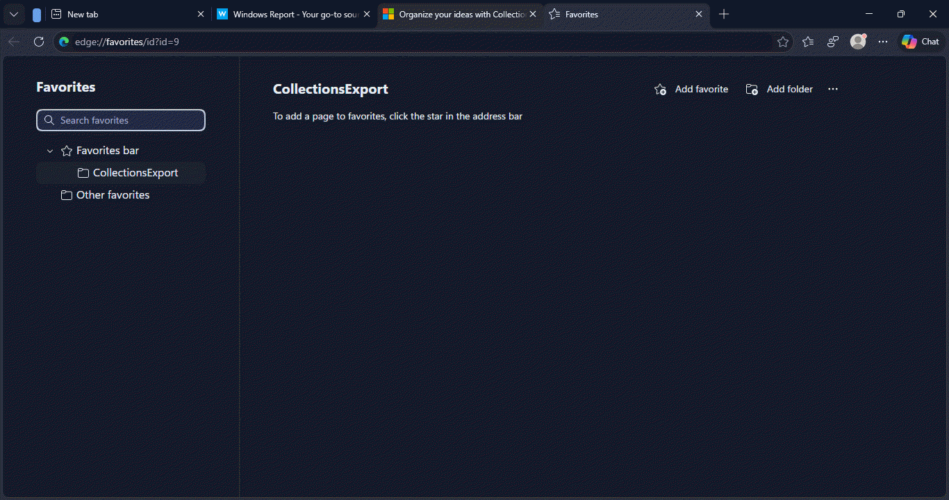 选择此选项后,Edge 会在“收藏夹”页面创建名为“CollectionsExport”的文件夹,并将集锦内保存的所有网页移动到收藏夹,不过能够迁移的只有网页,用户需要自行备份图片、备注内容。