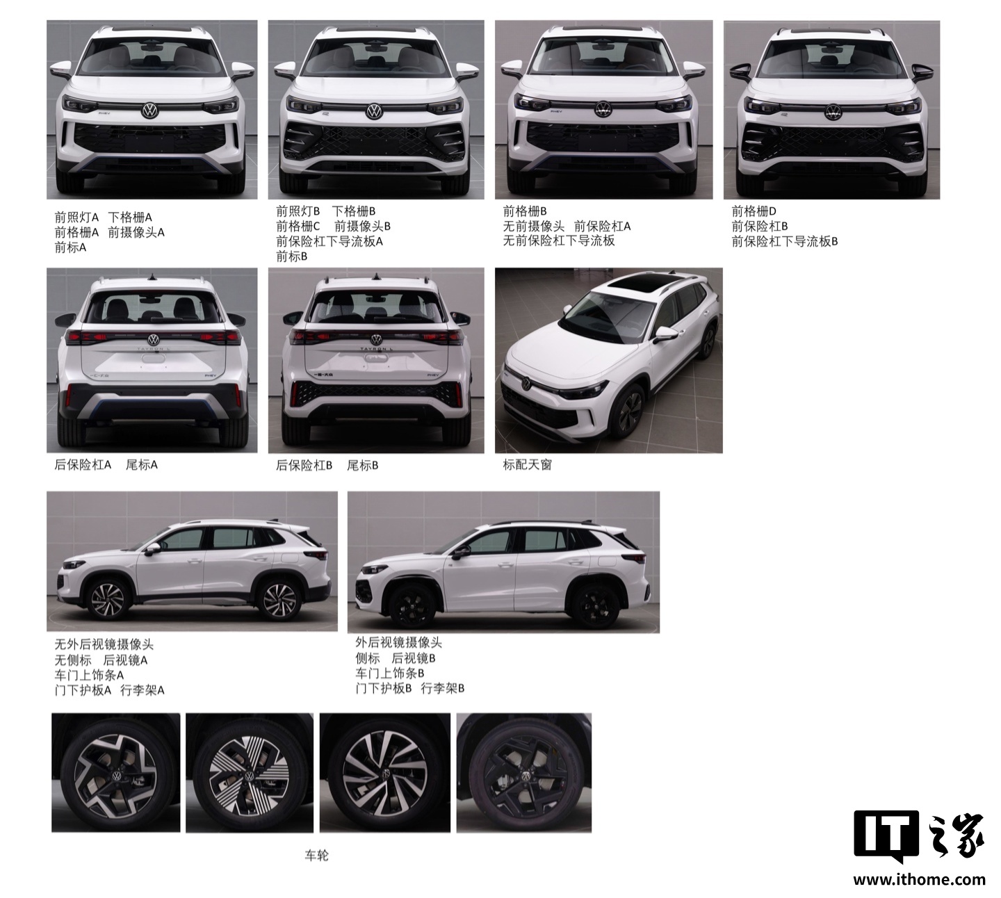 此外,探岳 L PHEV 还为消费者提供了丰富的选装配置,包括不同样式的前照灯、下格栅、前格栅、前摄像头、前标识、前保险杠、前保险杠下导流板、后保险杠以及尾标等。同时,新车还提供了 4 种样式的轮辋可供选择。