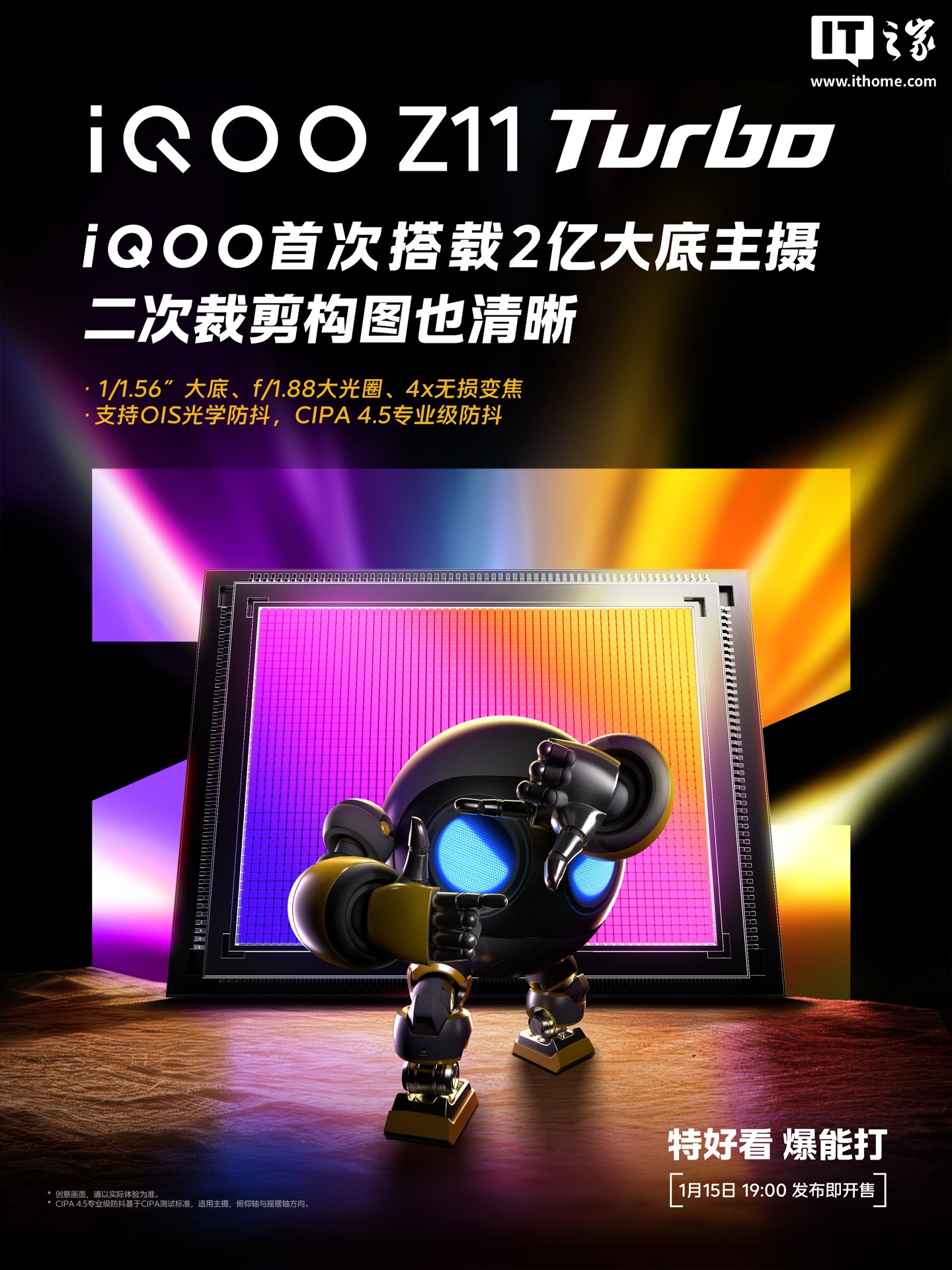 官方预热海报显示,iQOO Z11 Turbo 新机的 2 亿大底超级主摄拥有 1/1.56'' 大底、f/1.88 大光圈,同时还支持 OIS 光学防抖。