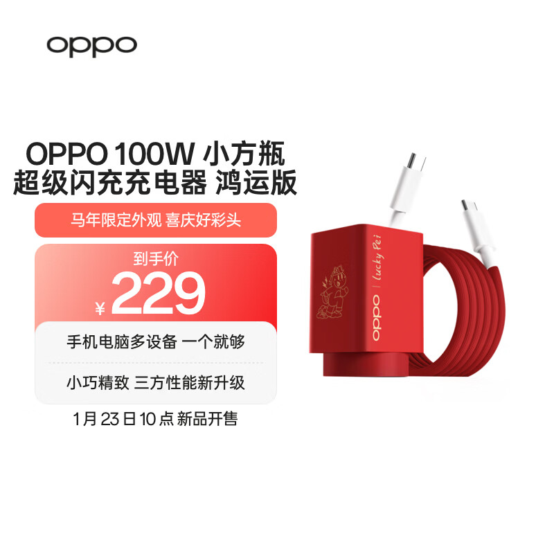 OPPO 100W 小方瓶超级闪充氮化镓充电器、磁力集结线套装鸿运版 229 元:新春限定鸿运外观,特别升级了第三方手机充电性能,至高高达 100W 高功率疾速充电,仅需 30 分钟即可为 iPhone17 充进约 62% 电量。