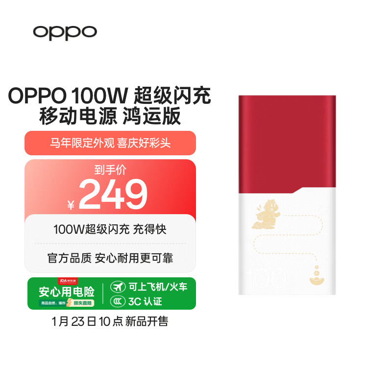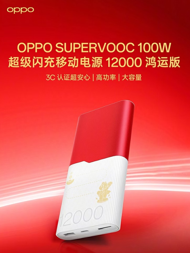 OPPO SUPERVOOC 100W 超级闪充移动电源 12000 鸿运版 249 元:3C 认证可上飞机,3 颗 4000mAh 电芯串联,双口均支持 SUPERVOOC 超级闪充。