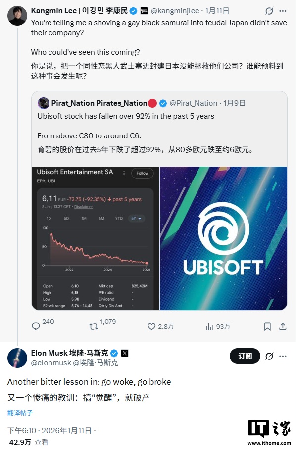在同一话题下,账号 @kangminilee 发布了一条带有讽刺意味的评论,称:“你是说把一个同性恋黑人武士塞进封建时代的日本,都没能拯救他们的公司?谁能预料到这种事会发生?”这一言论明显影射了近年来围绕育碧作品中角色设定、多元化与叙事方向的争议话题。