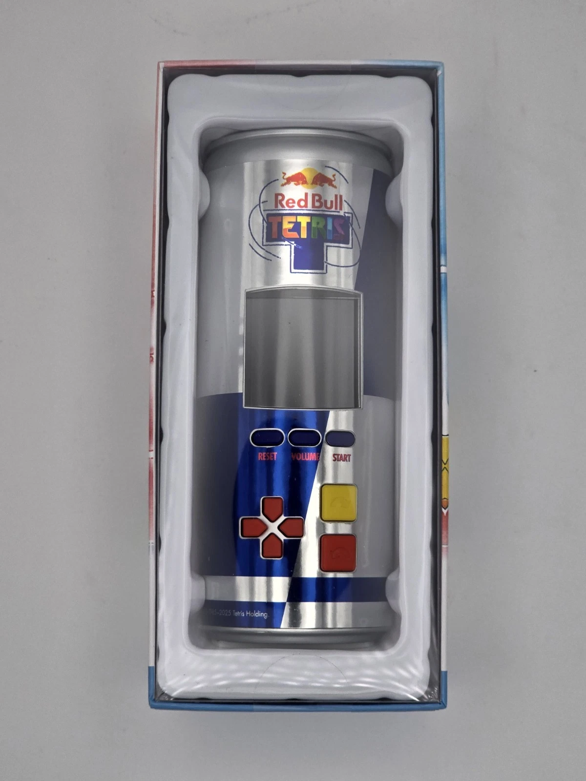这款掌机在外观上完美复刻了红牛能量饮料的经典罐体造型,内部硬件则由三节 AA 电池驱动。机身嵌入了一块 1.55 英寸的微型显示屏,并配有两个用于旋转方块的实体操作按钮,整体设计旨在还原最纯粹的《俄罗斯方块》体验。