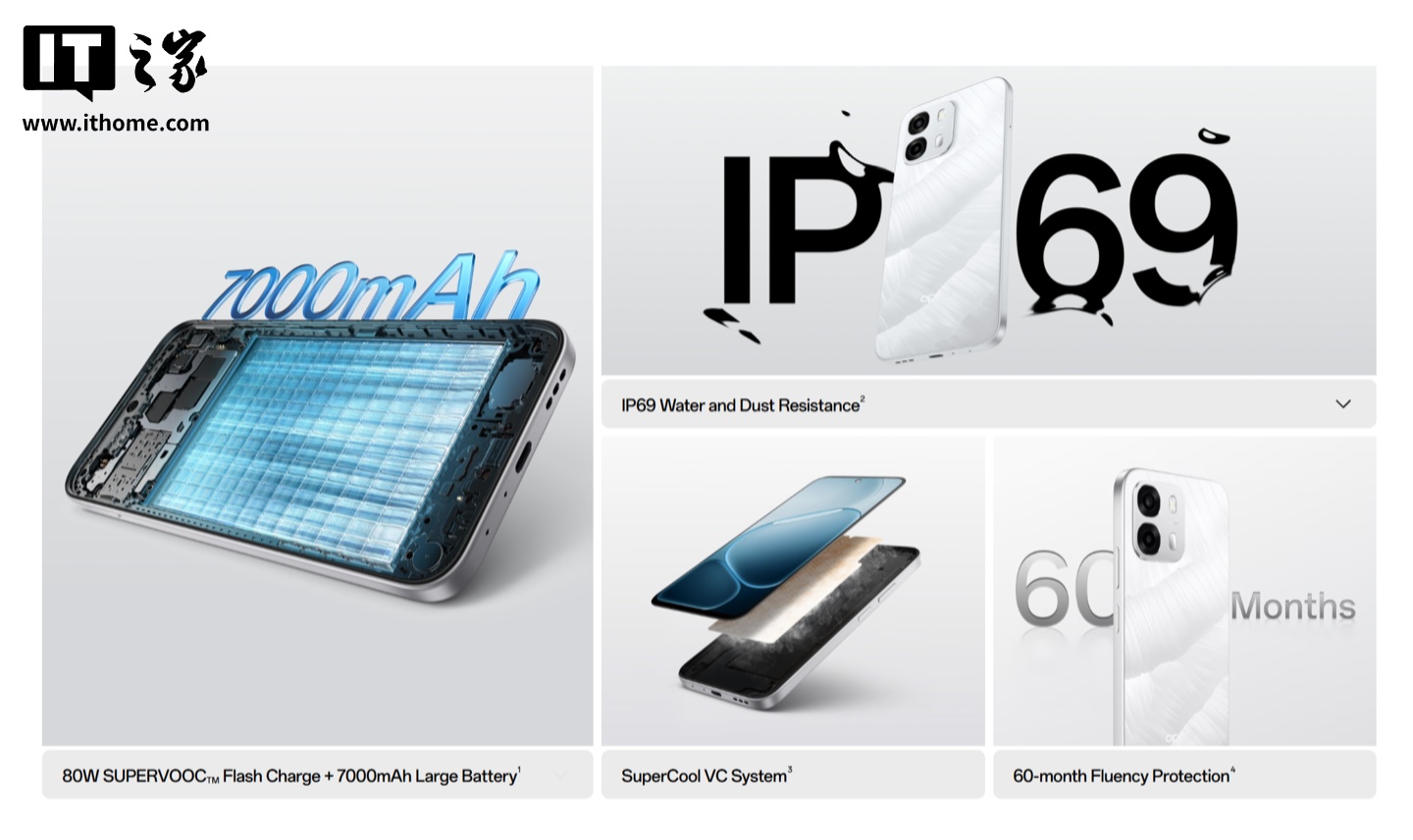 此外,这款手机通过了 IP69 防尘防水认证,拥有 5000 万像素后置主摄和 200 万像素黑白辅助摄像头,前置摄像头则是 1600 万像素,支持 80W SUPERVOOC 闪充,兼容 33W PPS、13.5W PD 通用快充协议,IT之家附上官方渲染图如下: