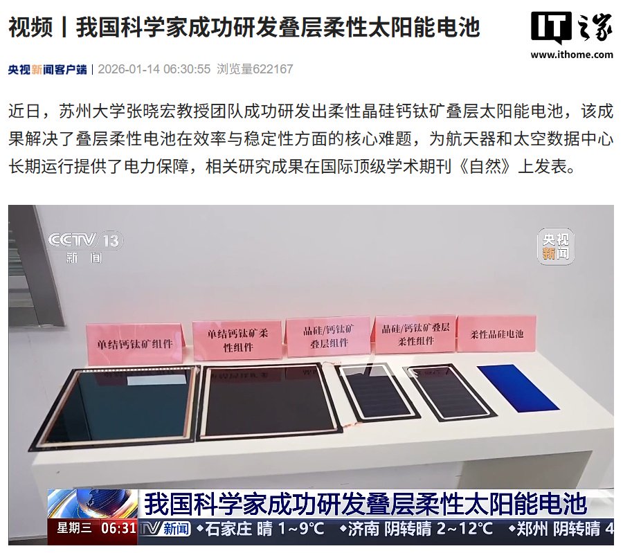 IT之家 1 月 14 日消息,据央视新闻今日报道,苏州大学张晓宏教授团队成功研发出柔性晶硅钙钛矿叠层太阳能电池,该成果解决了叠层柔性电池在效率与稳定性方面的核心难题,为航天器和太空数据中心长期运行提供了电力保障,相关研究成果在国际顶级学术期刊《自然》上发表。