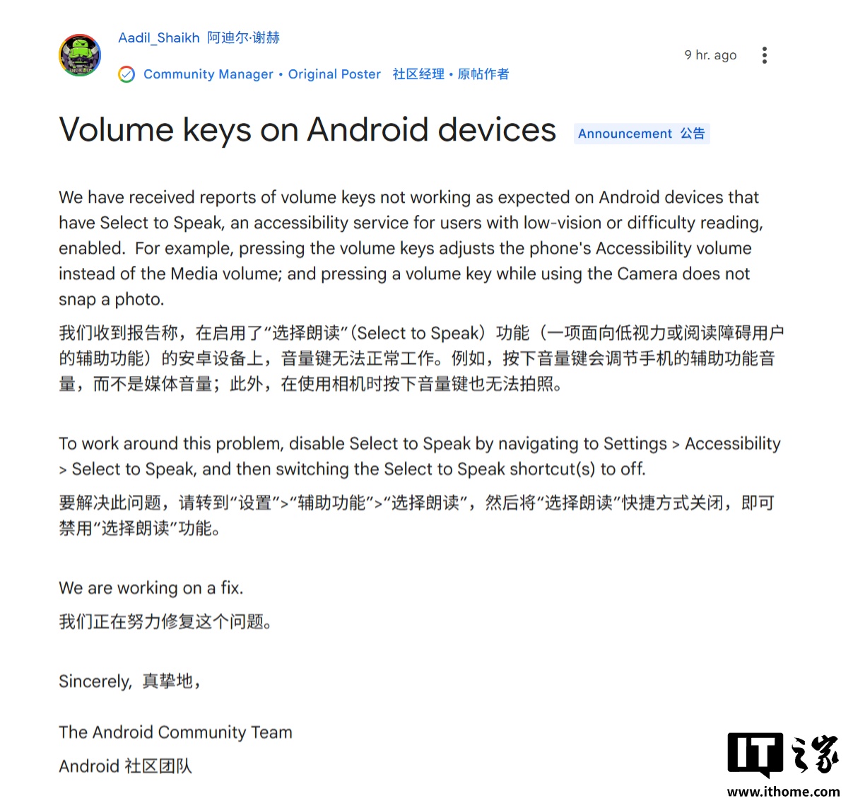 谷歌社区经理 Aadil Shaikh 在回应中承认了这一问题,他表示:“我们已收到报告,开启 Select to Speak 服务的安卓设备出现了音量键工作不符合预期的情况。”