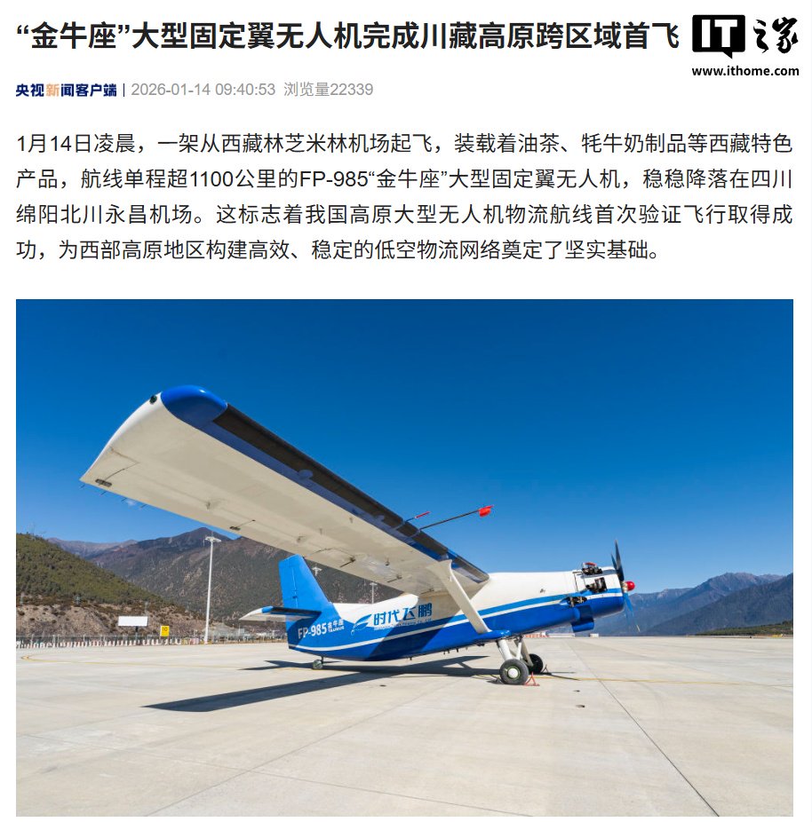 IT之家 1 月 14 日消息,据央视新闻报道,1 月 14 日凌晨,一架航线单程超 1100 公里的 FP-985“金牛座”大型固定翼无人机,从西藏林芝米林机场起飞,装载着油茶、牦牛奶制品等西藏特色产品,降落在四川绵阳北川永昌机场。