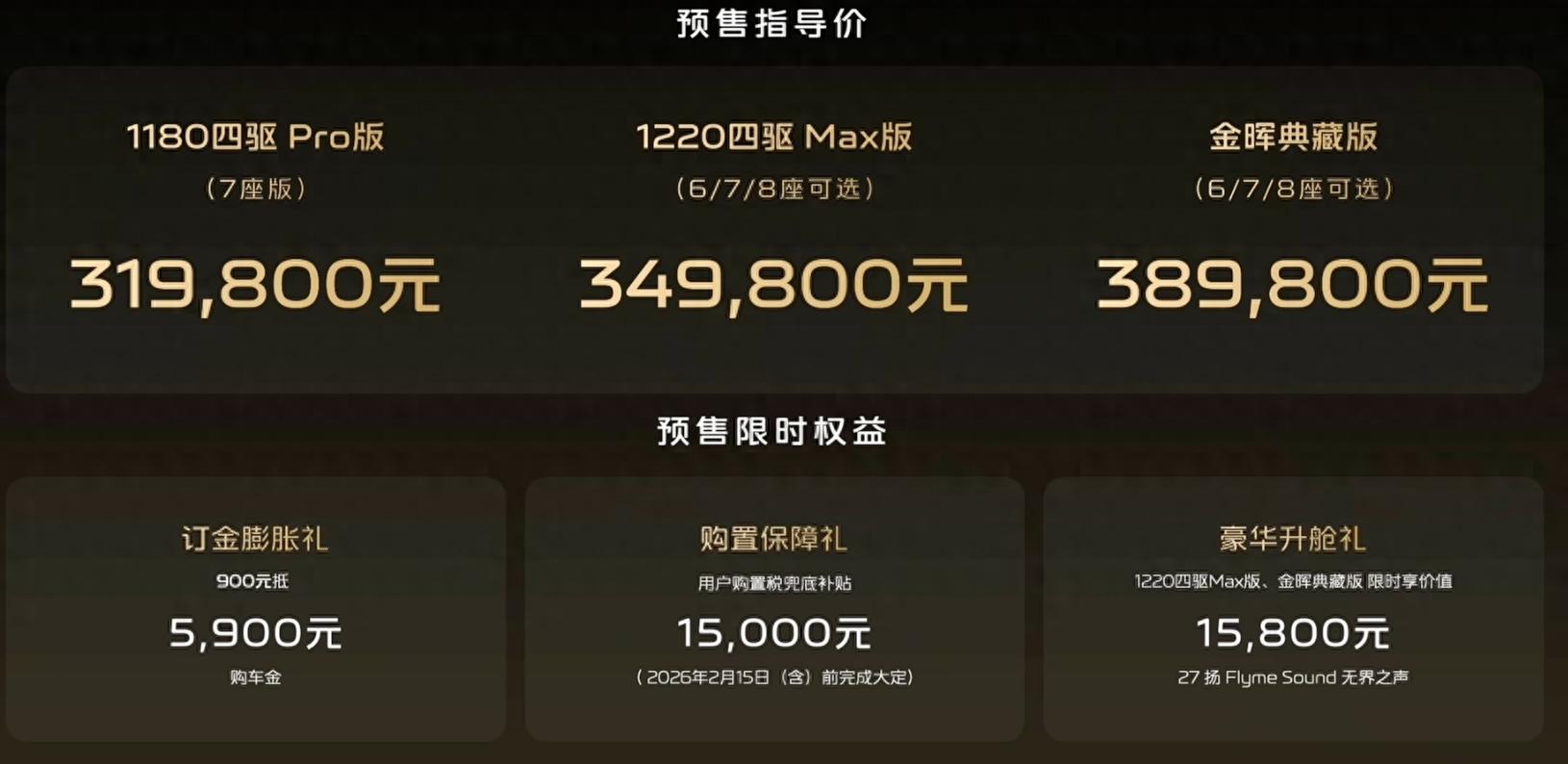 该车二排配备 17.3 英寸娱乐屏和 5.98 英寸功能控制屏,全车提供 4 个智能 50W 风冷无线快充。云感 SPA 座椅支持加热、通风、记忆、按摩等功能,Flyme Sound 无界之声 27 扬声器系统提供 9.1.6 声场,功率达 2300W,支持 AI 无麦 K 歌。此外,新车还配备 -6℃ 至 50℃ 温域的 9.1L 大容量冷暖箱。