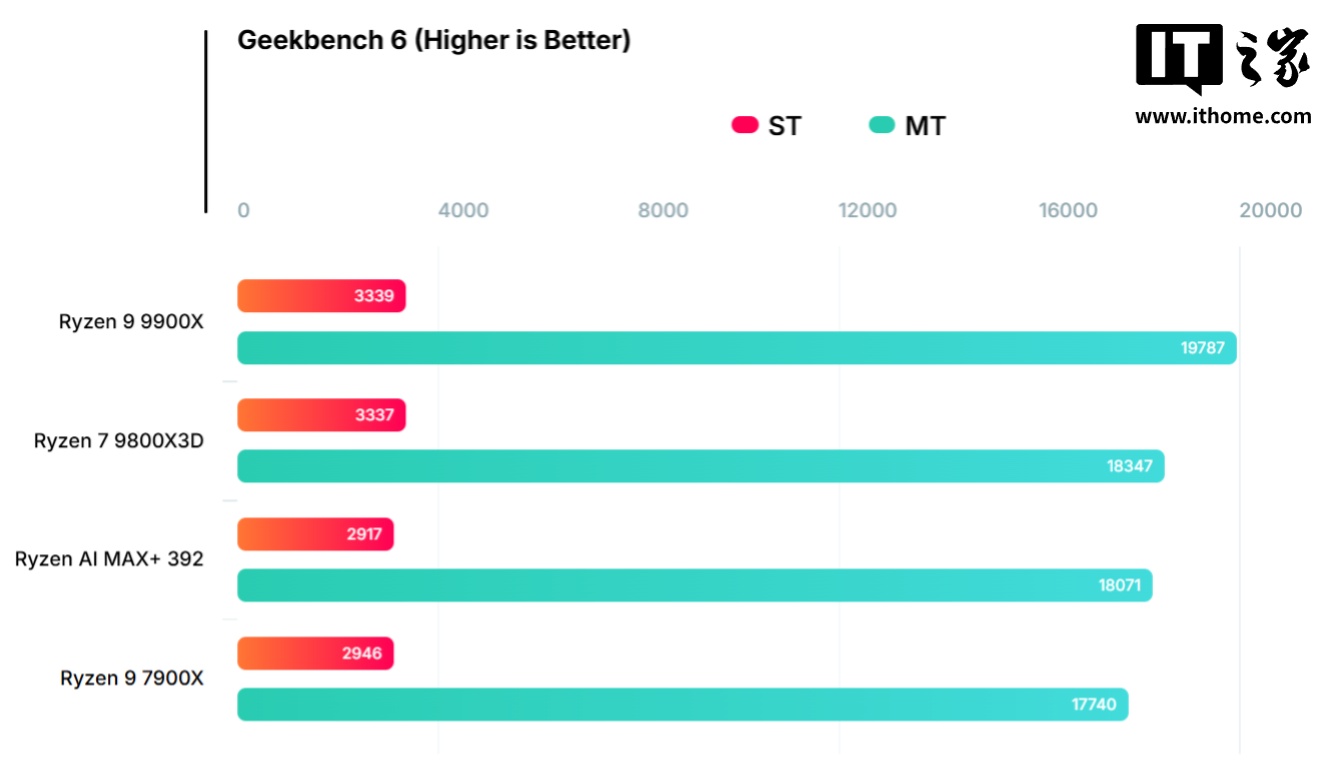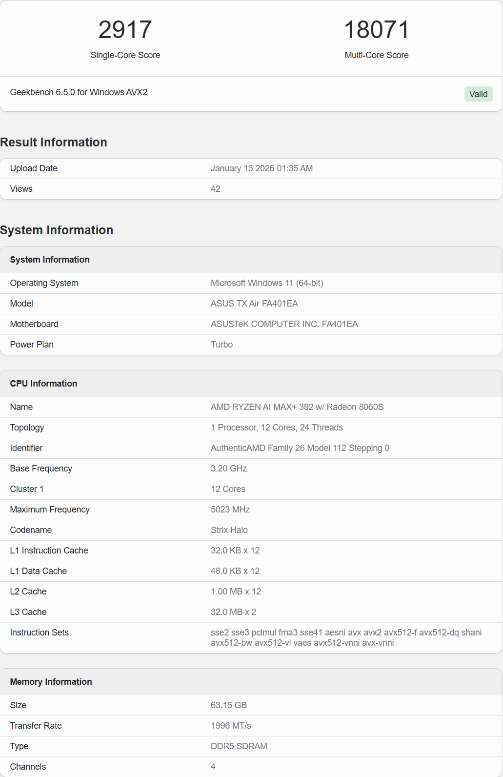 Geekbench 6 的测试数据直观展示了这款移动端 SoC 的强悍实力,Ryzen AI MAX+ 392 取得了单核 2917 分、多核 18071 分的优异成绩。