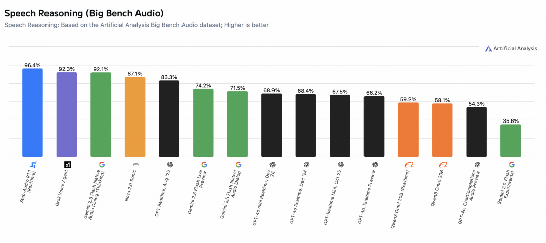 阶跃星辰表示,和大语言模型同理,语音模型同样需要具备强大推理能力,才能提供更高阶智能、更自然交互。Step-Audio-R1.1 以 96.4% 准确率,超越 Grok、Gemini、GPT-Realtime 等主流一线模型,刷新历史最好成绩。在性能与速度的综合权衡上,Step-Audio-R1.1 全面碾压同类语音模型。