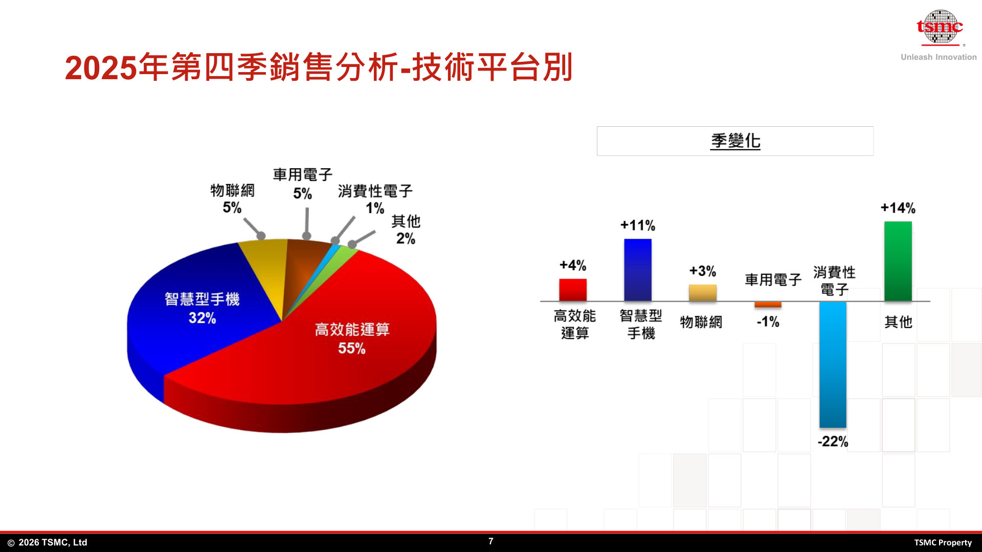IT之家 1 月 15 日消息,台积电在该企业的 2025 年第四季度法人说明会简报演示文稿中表示,去年 HPC 高性能计算 / 高效能计算领域的营收同比大增 48%,整体营收占比来到 58%,稳居按技术平台划分的第一大收入来源。