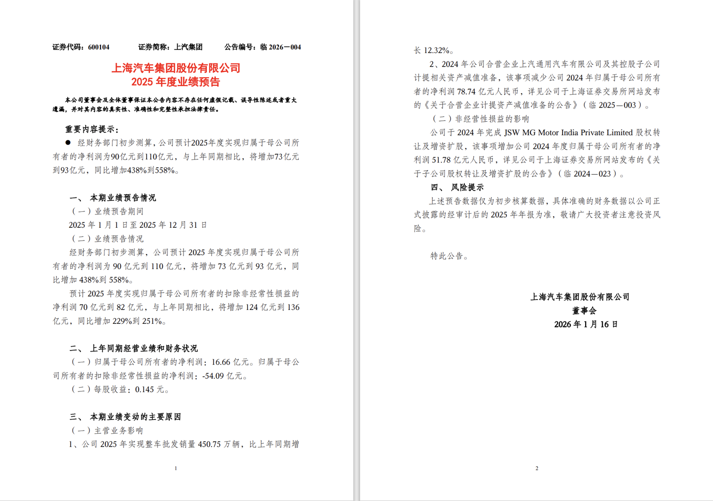 IT之家 1 月 15 日消息,今天下午,上汽集团发布业绩预告,公司预计 2025 年度实现归属于母公司所有者的净利润为 90 亿元到 110 亿元,与上年同期相比,将增加 73 亿元到 93 亿元,同比增加 438% 到 558%。