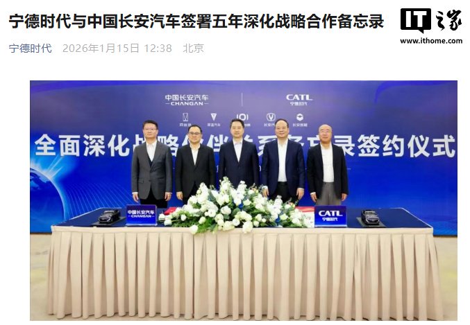 IT之家 1 月 15 日消息,据宁德时代官方公众号,1 月 14 日,中国长安汽车与宁德时代在重庆签署为期五年的全面深化战略伙伴关系备忘录,围绕技术应用、市场拓展、模式创新、海外布局及品牌传播等方向开展合作。