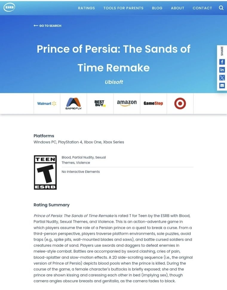 IT之家 1 月 16 日消息,育碧旗下游戏《波斯王子:时之沙》重制版已通过 ESRB 评级认证,获评 T 级(青少年级,适合 13 岁以上玩家)。