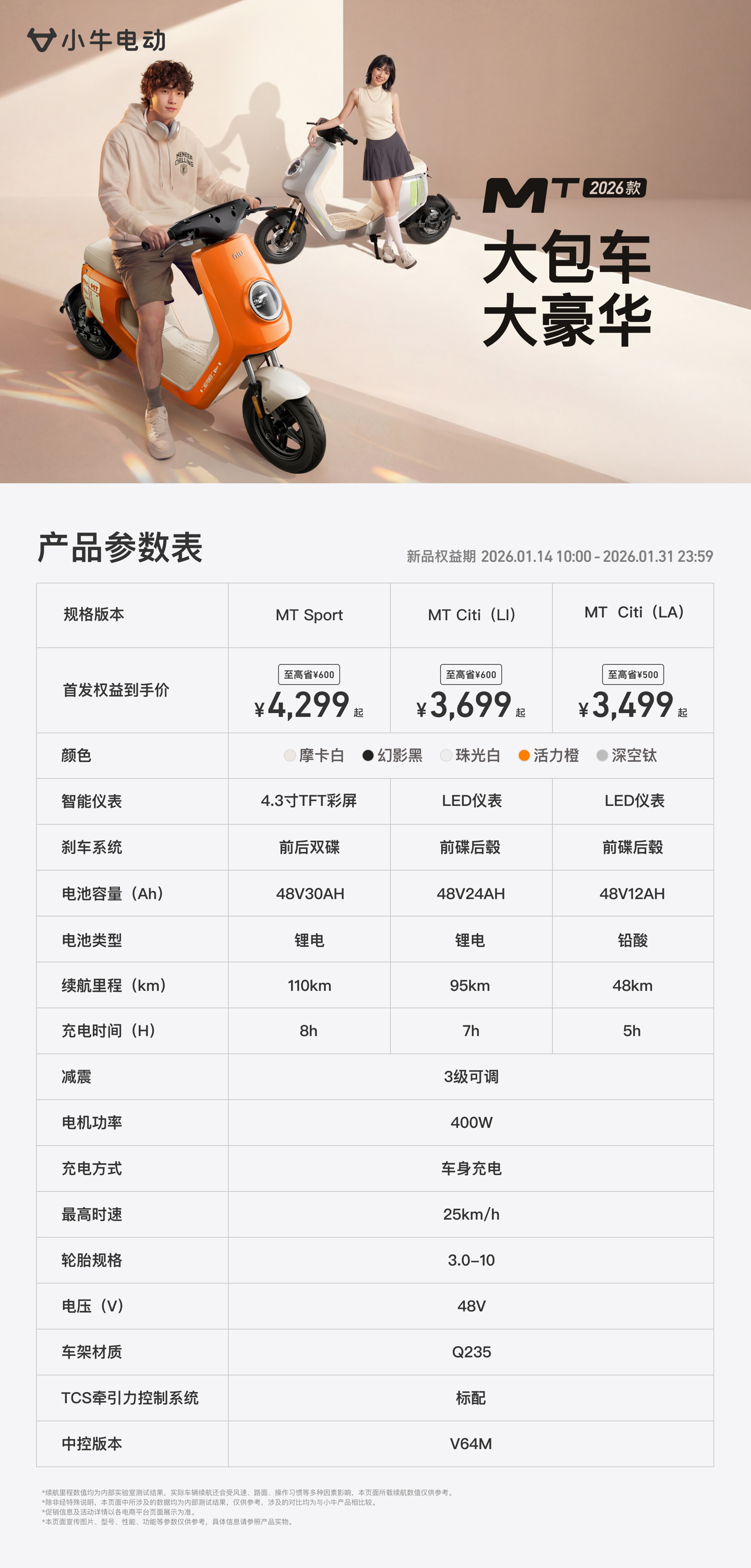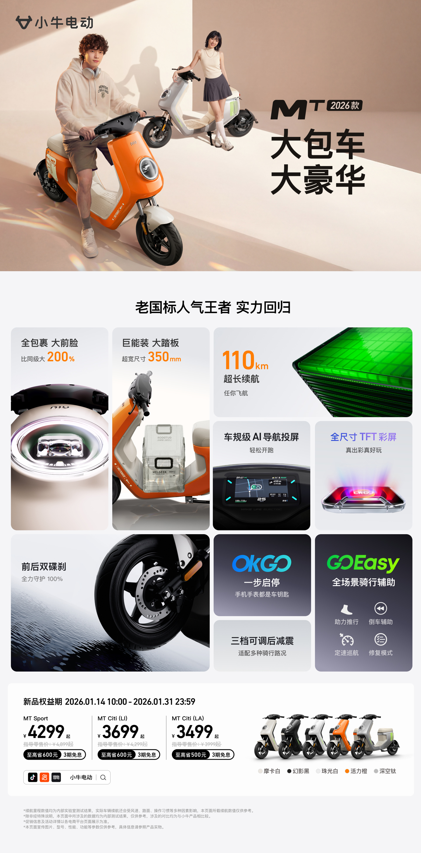 IT之家 1 月 16 日消息,小牛 MT2026 电动自行车已于 1 月 14 日宣布上市,新品权益价 3499~4299 元。
