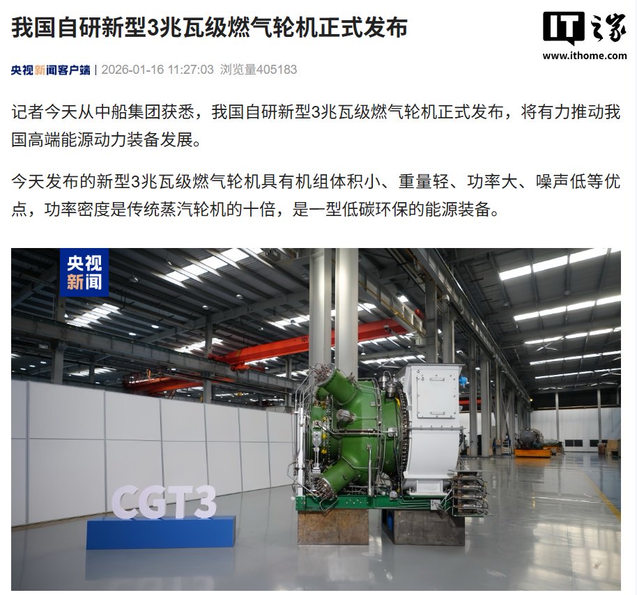 IT之家 1 月 16 日消息,据央视新闻今日(1 月 16 日)报道,我国自研新型 3 兆瓦级燃气轮机正式发布,将有力推动我国高端能源动力装备发展。