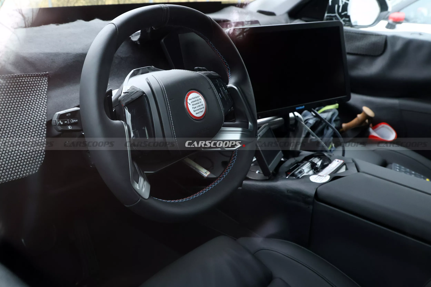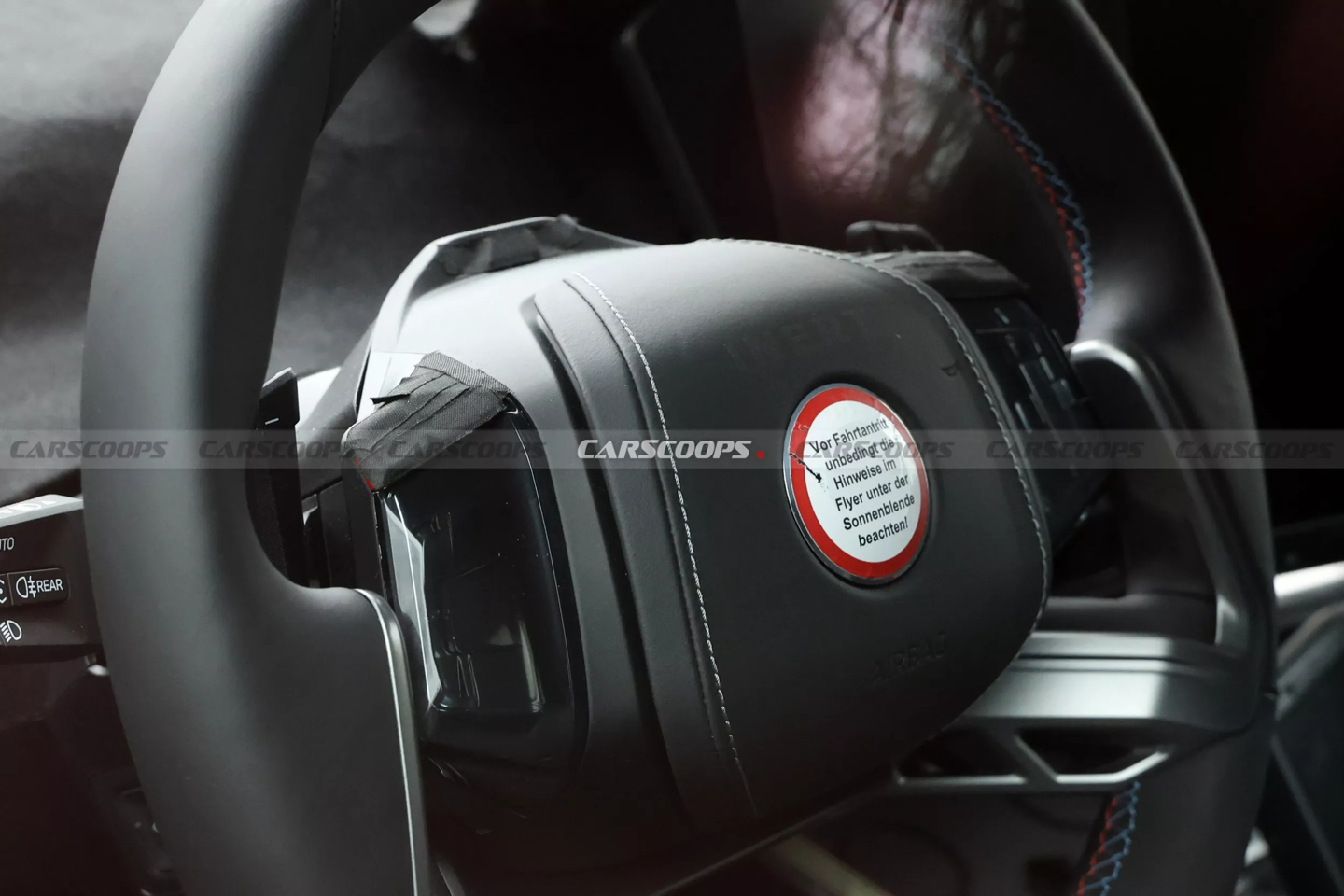 内饰方面,谍照显示新车将采用摒弃垂直辐条设计的 M 专属运动方向盘,并辅以红蓝撞色缝线及被胶带遮盖的 M 专属按钮。