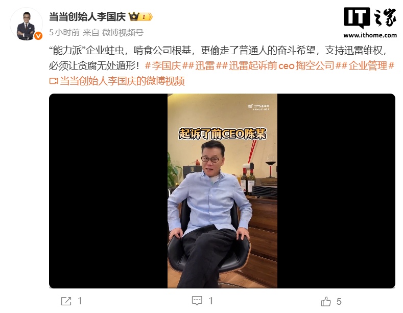 李国庆还配文称:“能力派”企业蛀虫,啃食公司根基,更偷走了普通人的奋斗希望,支持迅雷维权,必须让贪腐无处遁形。