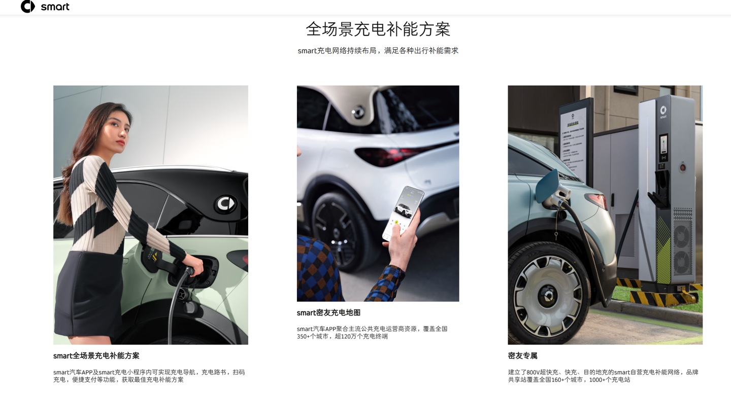 此外,smart 建立了 800V 超快充、快充、目的地充的自营充电补能网络,品牌共享站覆盖全国 160+ 个城市,1000+ 个充电站