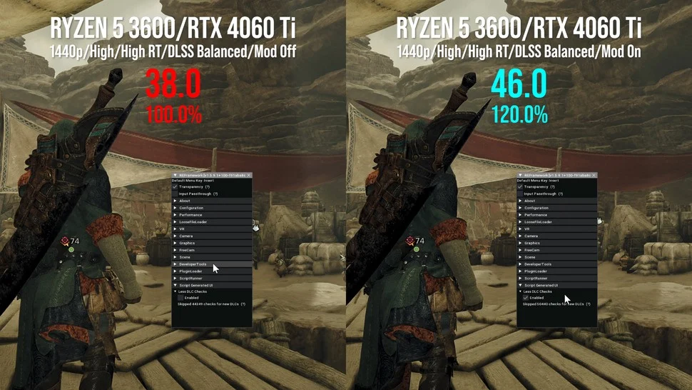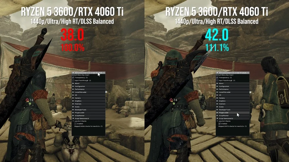在 1440p 分辨率、开启光追和 DLSS 平衡模式的最高画质下,屏蔽 DLC 检查后帧率提升了 11.4%;