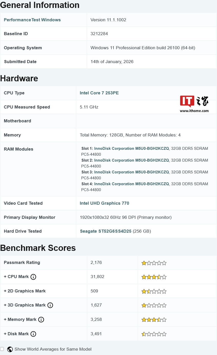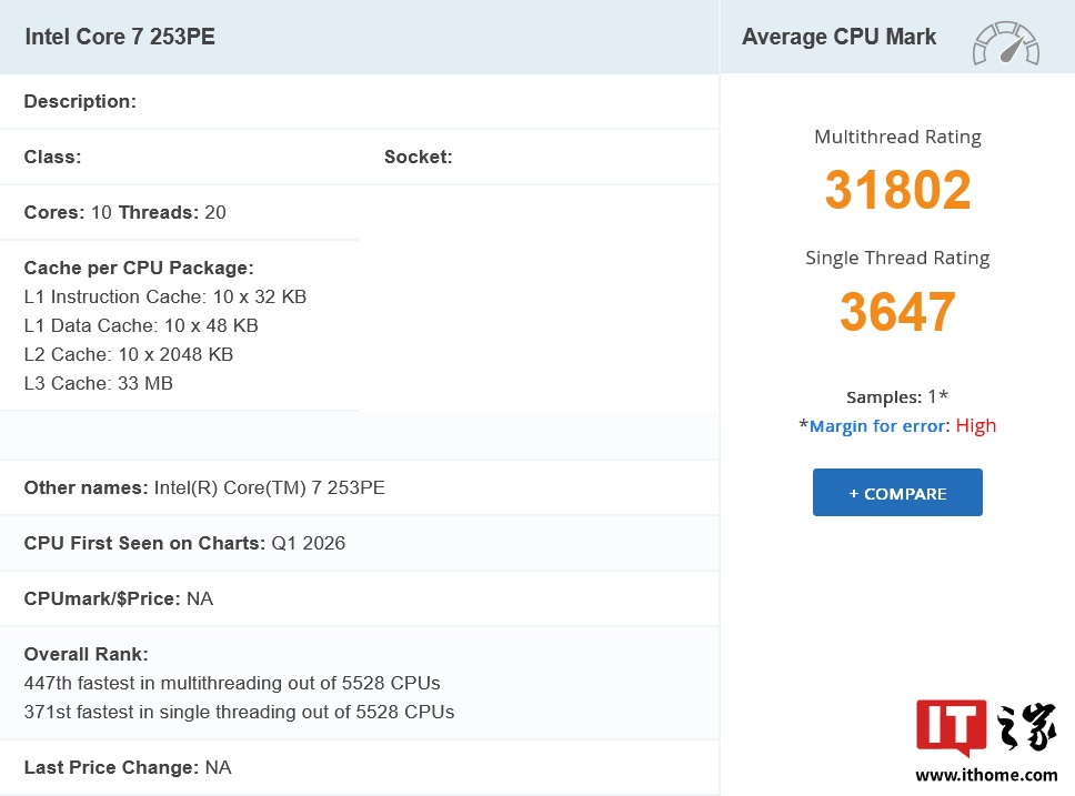 IT之家 1 月 17 日消息,PassMark 基准测试数据库现已记录到了英特尔酷睿 7 253PE 处理器。从其 10 核心 20 线程的设计来看,这应该就是面向边缘与嵌入式领域的 "Bartlett Lake 12P" 系列纯性能核(纯 P 核、纯大核)处理器的一员。
