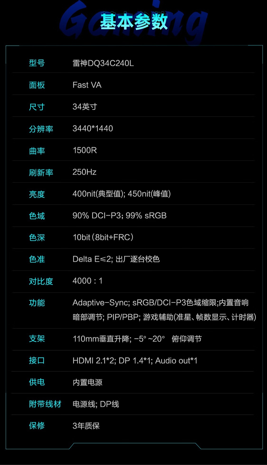 IT之家从商品页面获悉,这款显示器采用 34 英寸 Fast-VA 面板,具备 1500R 曲率、3440*1440 分辨率、250Hz 刷新率、HDR 450nits 亮度,支持 HDR400,拥有 90% DCI-P3 和 99% sRGB 色域。