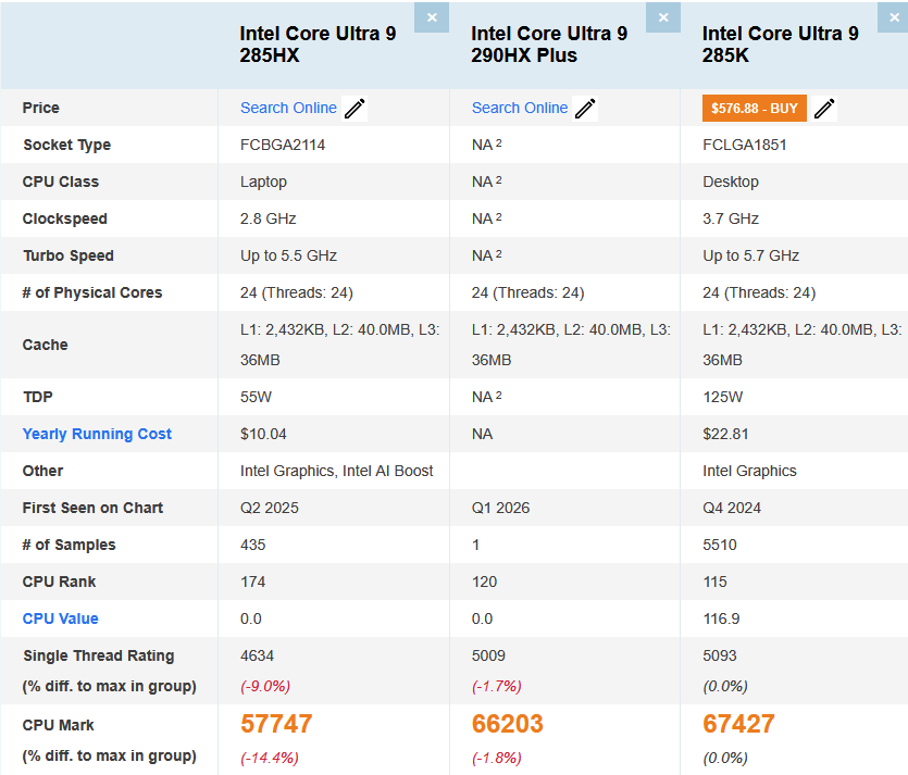 此外酷睿 Ultra 9 290HX Plus 的跑分成绩(单核 5009 / 多核 66203)已经无限逼近英特尔桌面级旗舰 CPU 酷睿 Ultra 9 285K(单核 5093 / 多核 67430),两者在理论性能上的差距已不足 2%。