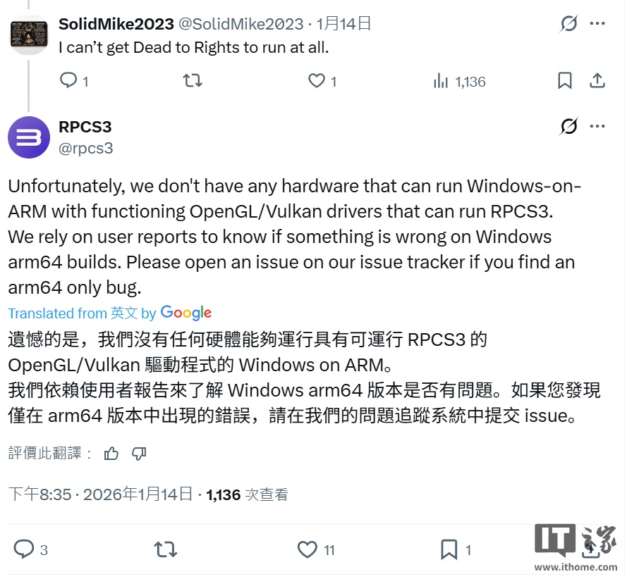 尽管原生版本已经发布,但 RPCS3 团队指出,由于他们手上没有配备完整 OpenGL / Vulkan 驱动的 WoA 设备,因此部分游戏仍然存在兼容性问题。如果用户在游戏中遇到了任何 Bug,可以及时通过 Issue Tracker 联系开发团队。